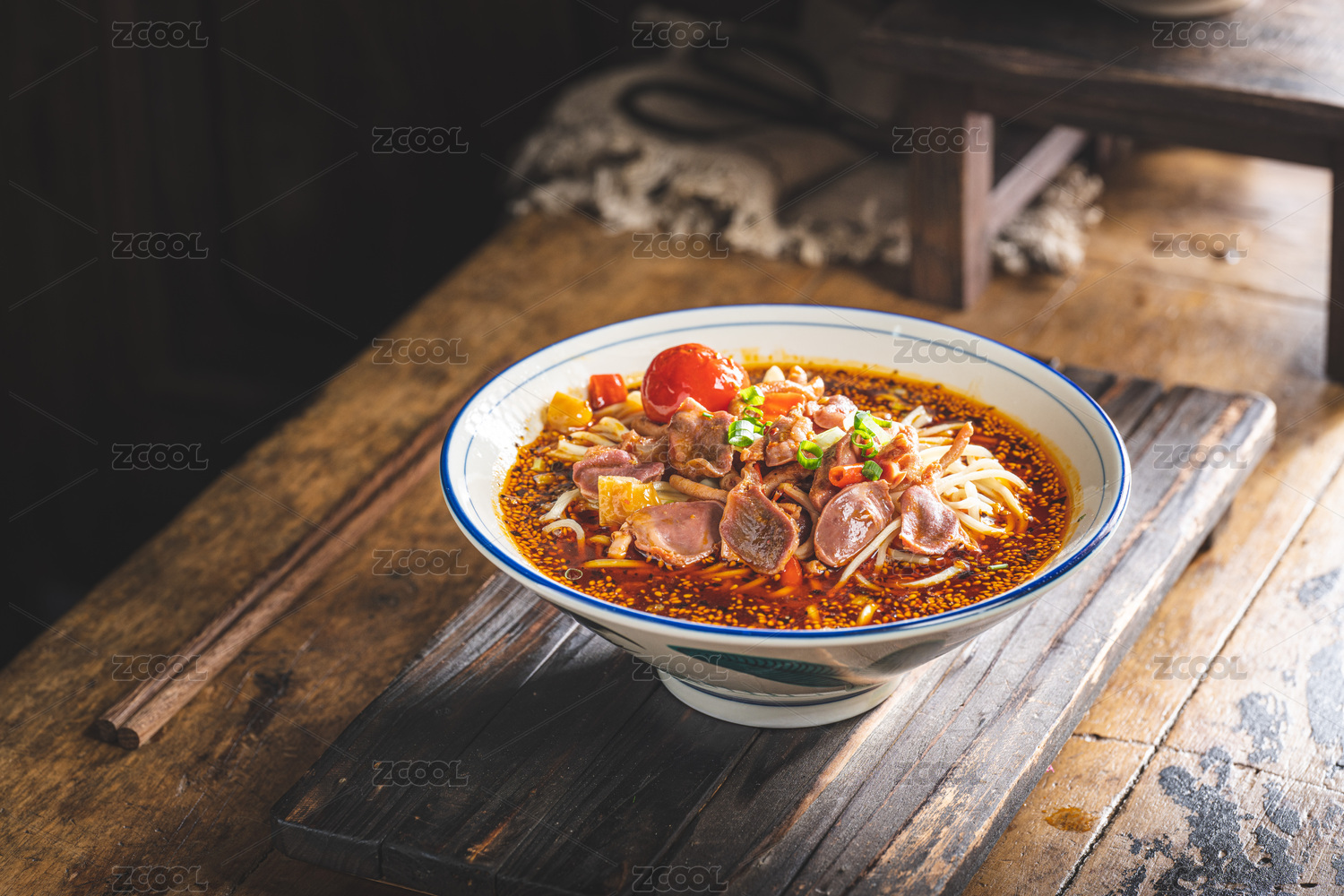 棕色桌面上放着一碗蛹虫草清汤米线