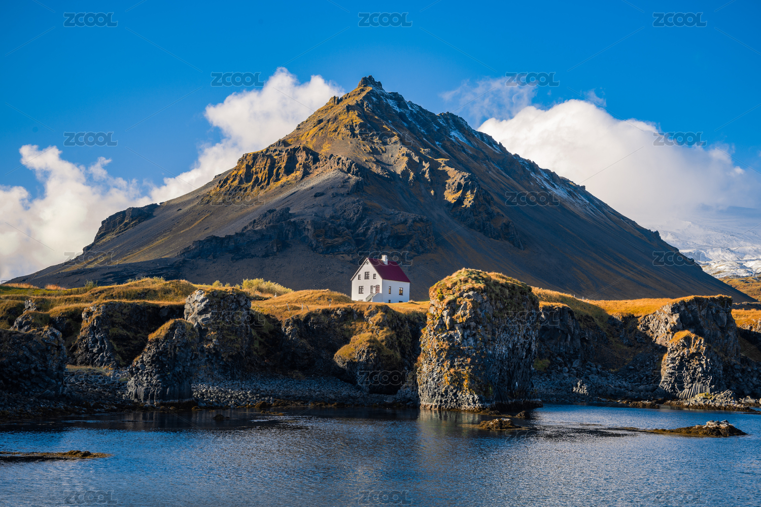 冰岛阿尔纳斯塔皮小镇海边的可爱木屋和雄伟山脉