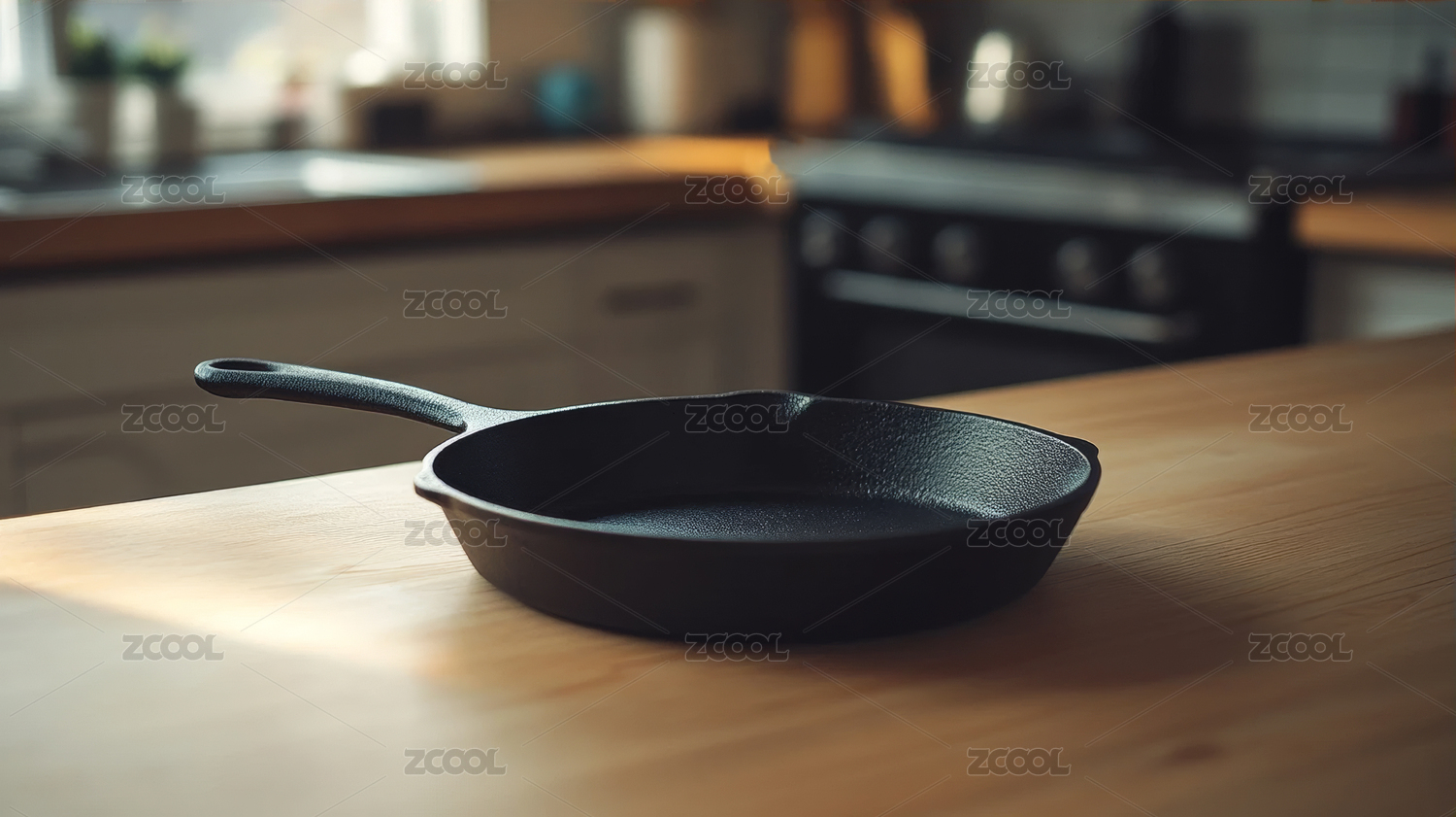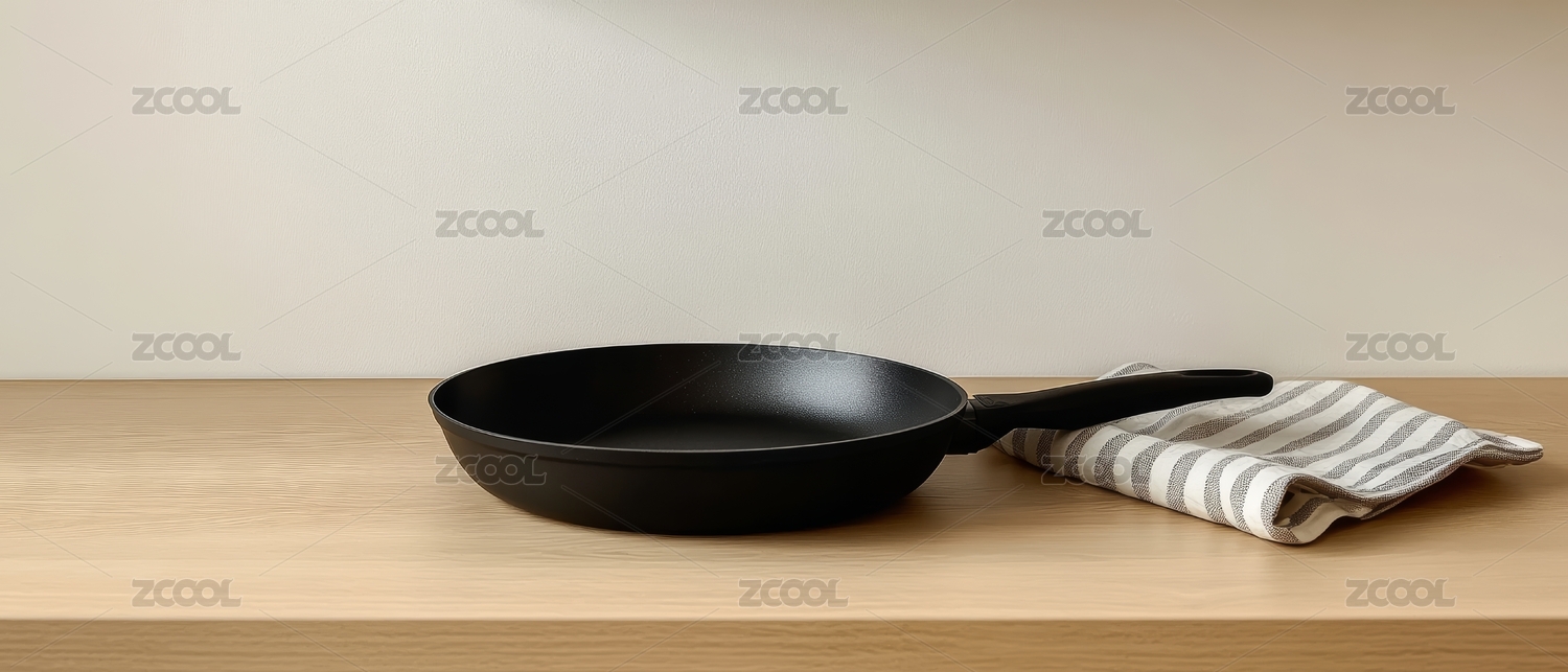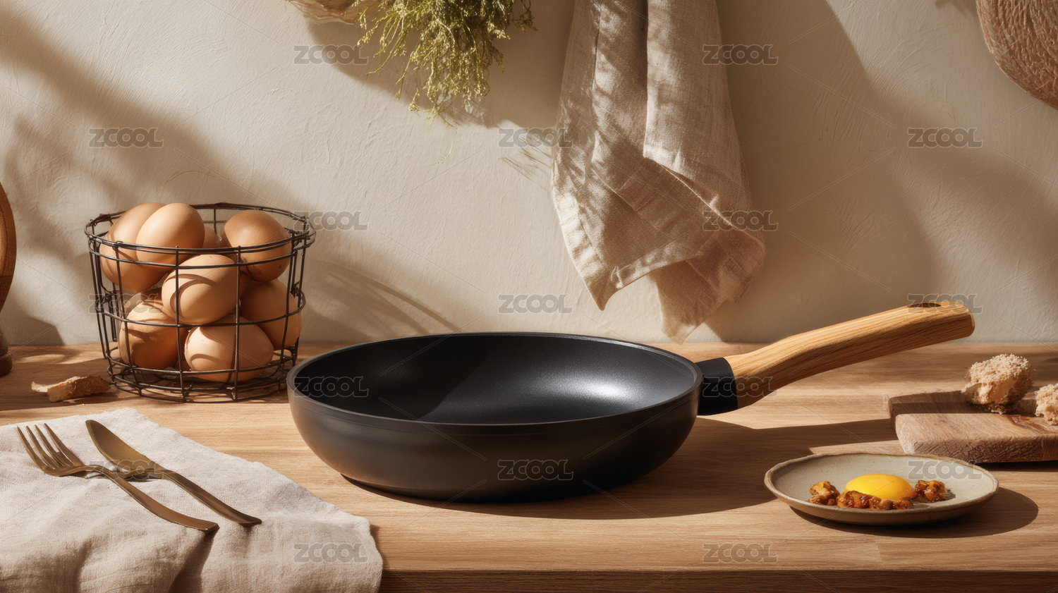 一只空小奶锅与若干的食材一起摆放在桌面上