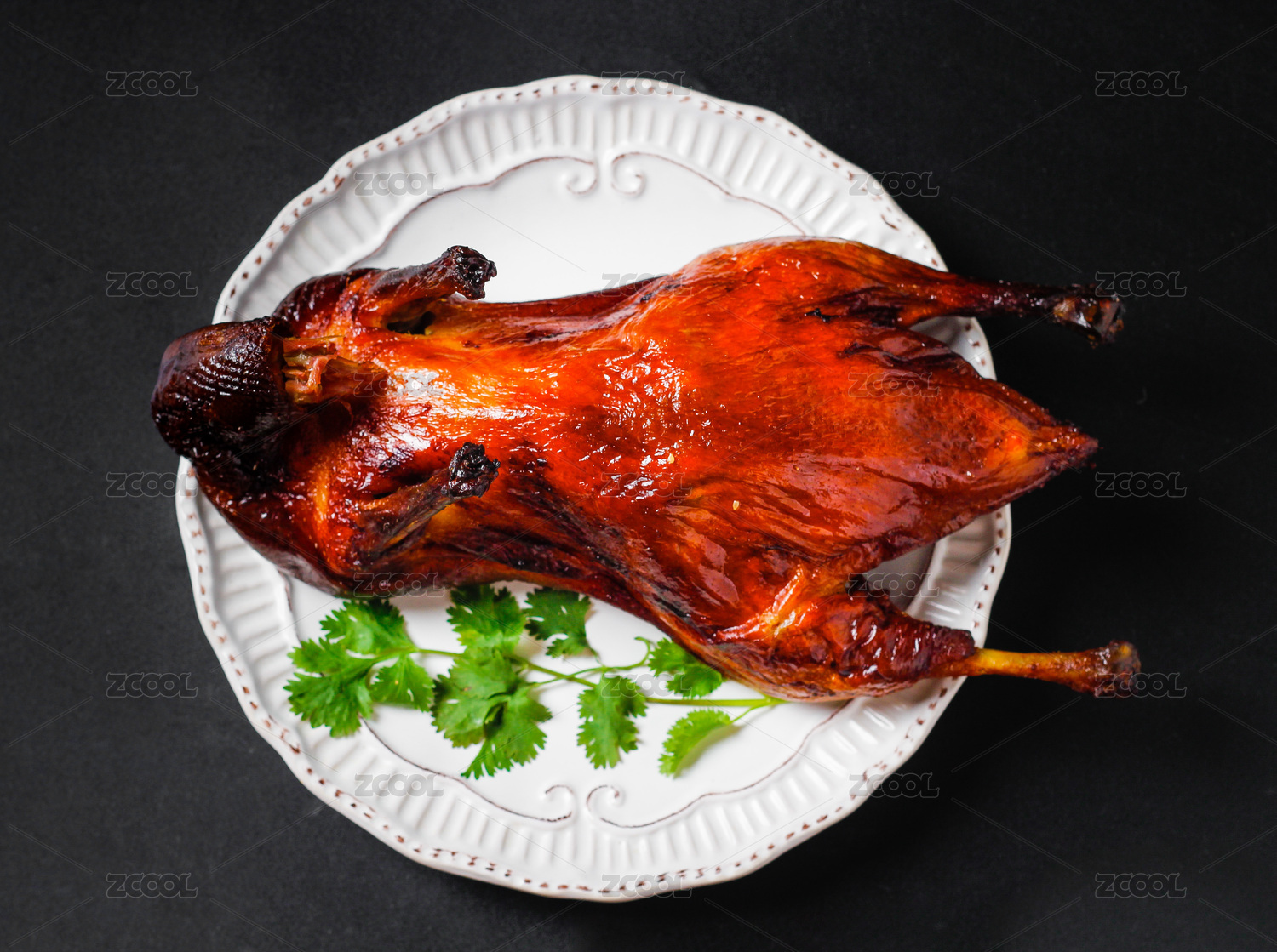黑底上放着一盘烤鸭