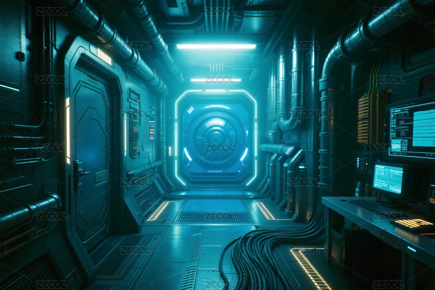 科幻,神秘,蓝色,红色,场景,氛围,霓虹灯,金属,管道,工业