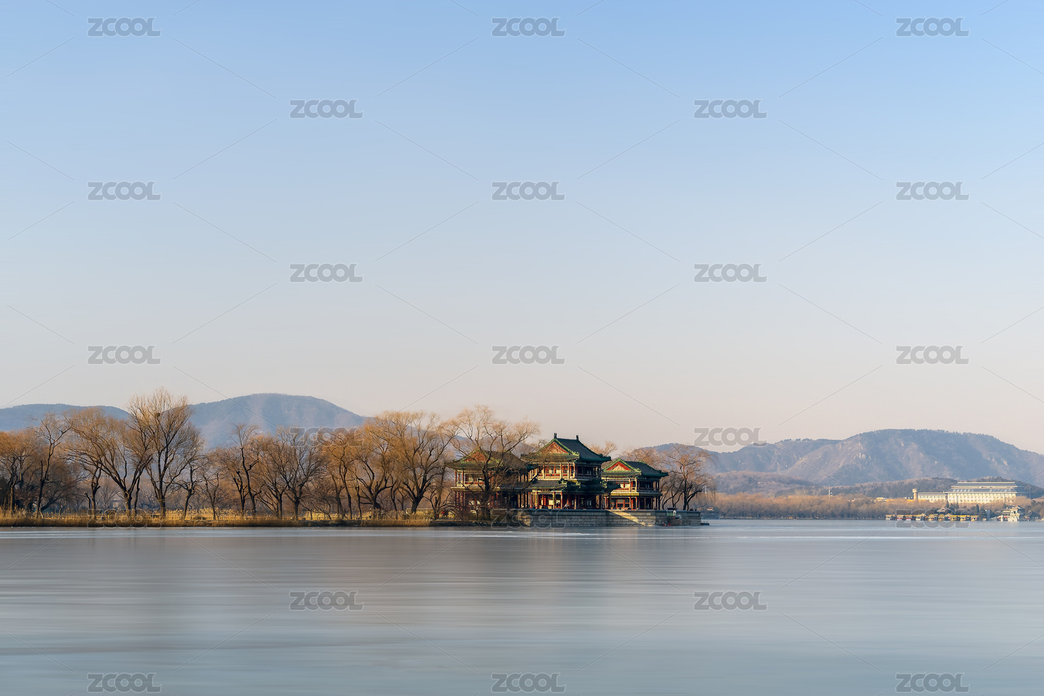 冬季蓝天下的中国北京颐和园昆明湖风光