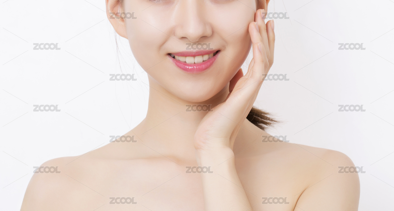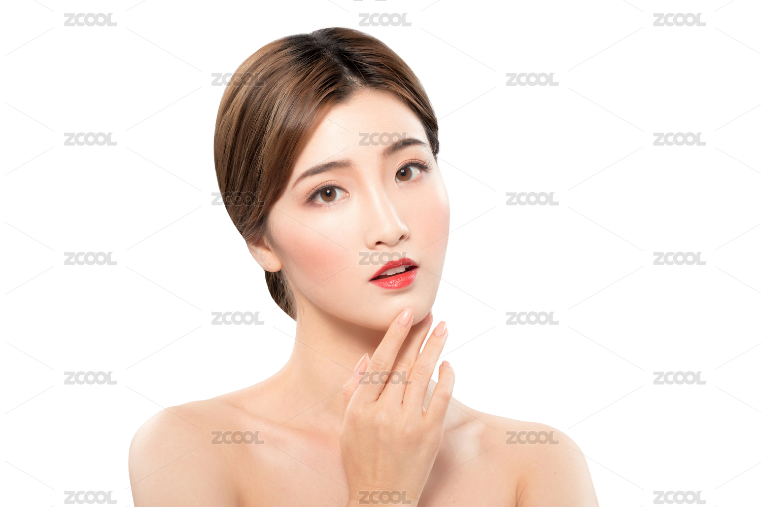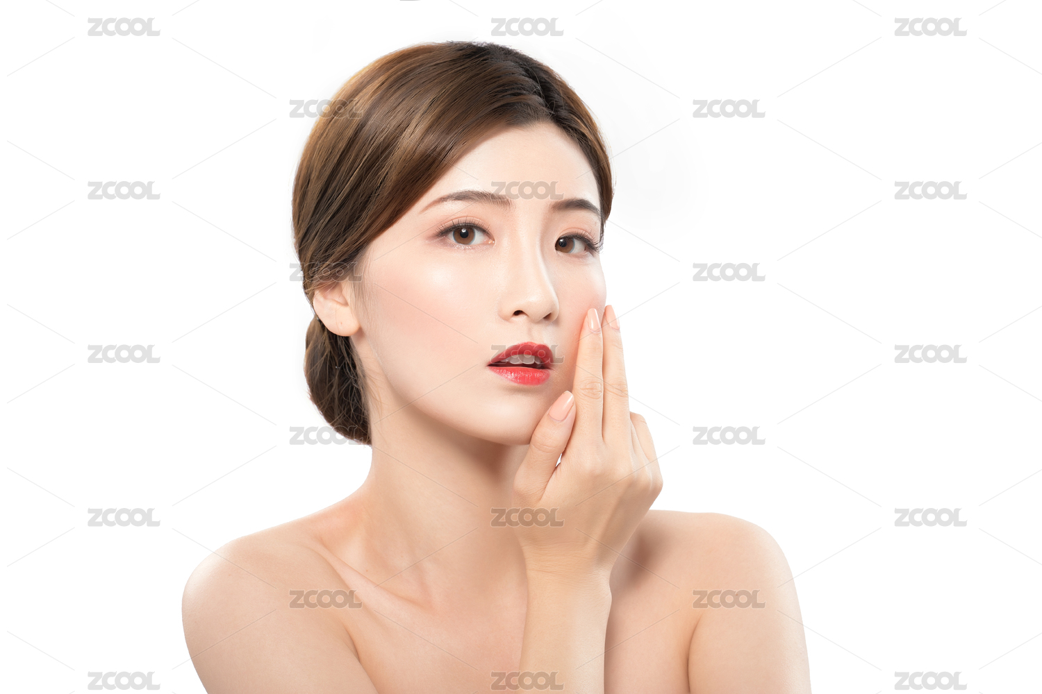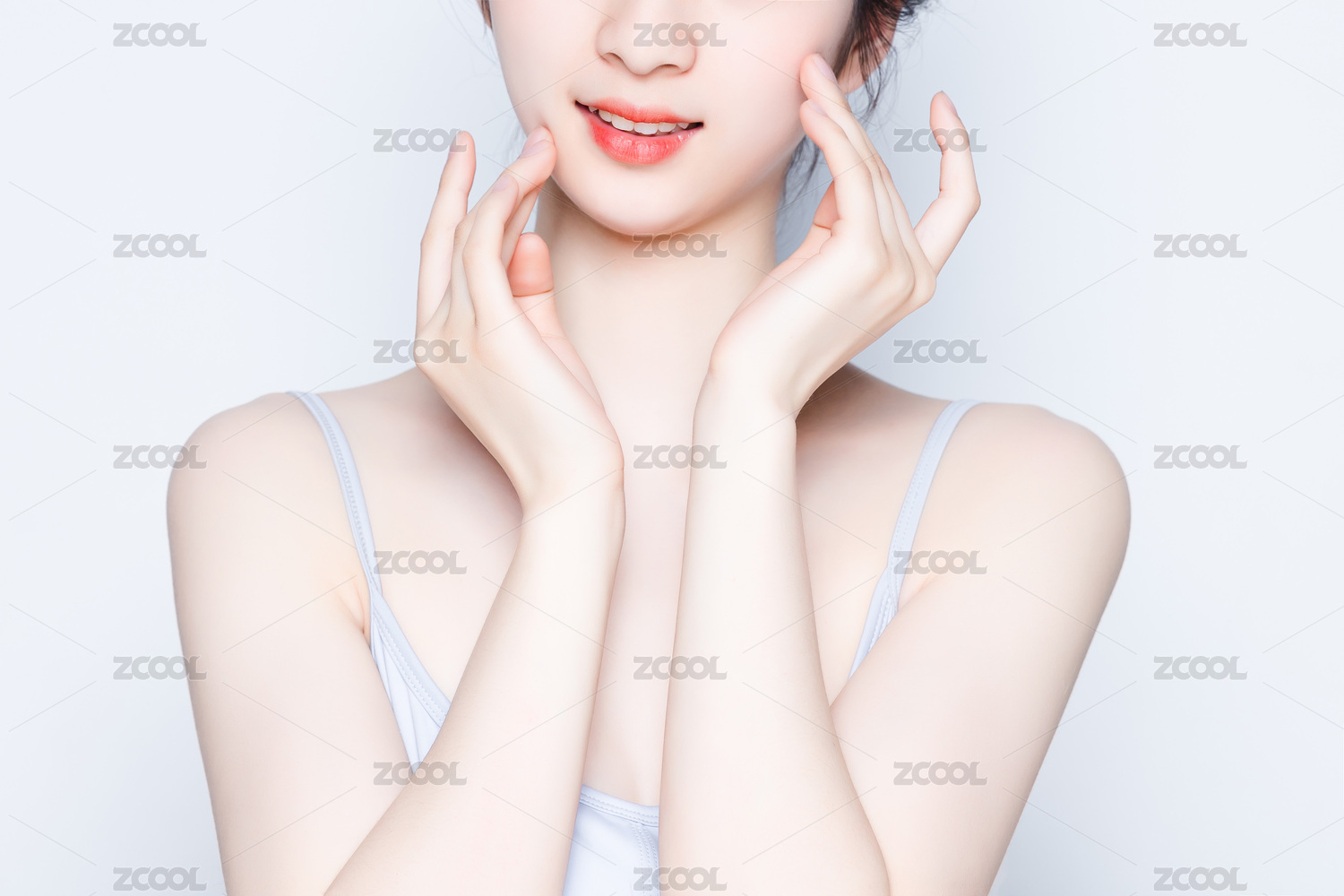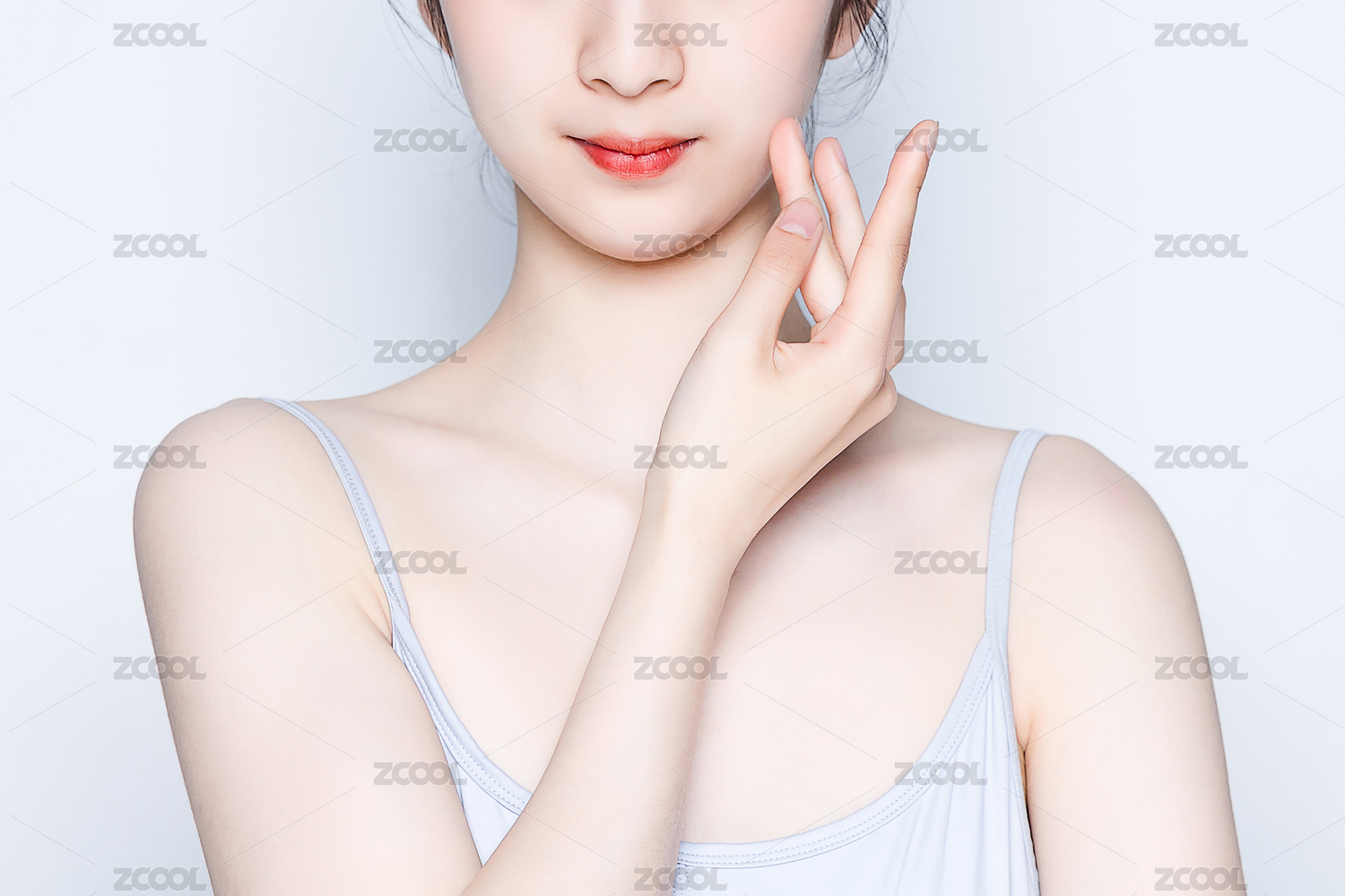 年轻漂亮的女性,用手抚摸光滑的皮肤,室内棚拍