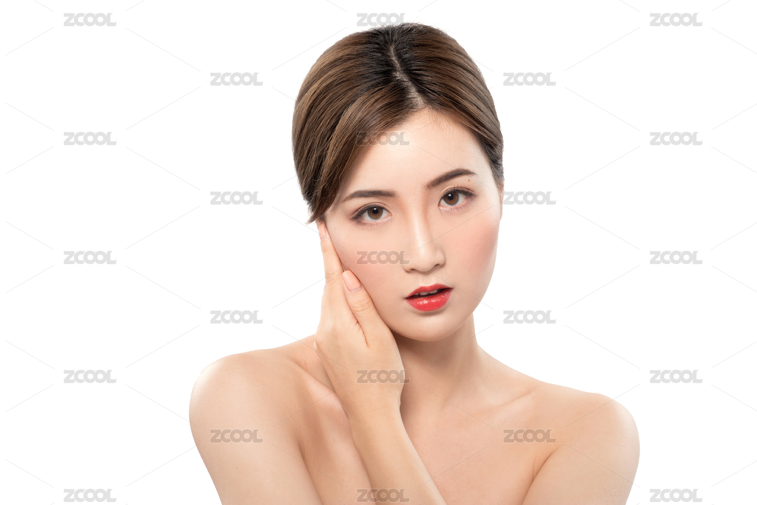 性感美女亚洲女子抚摸她的嘴唇面对摄像头,被隔绝在白色背景
