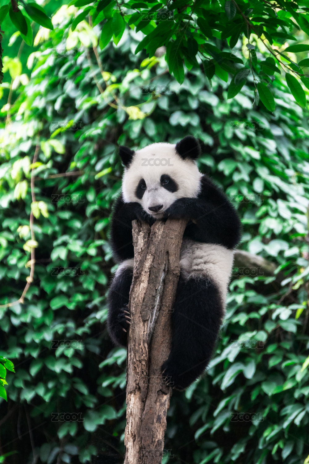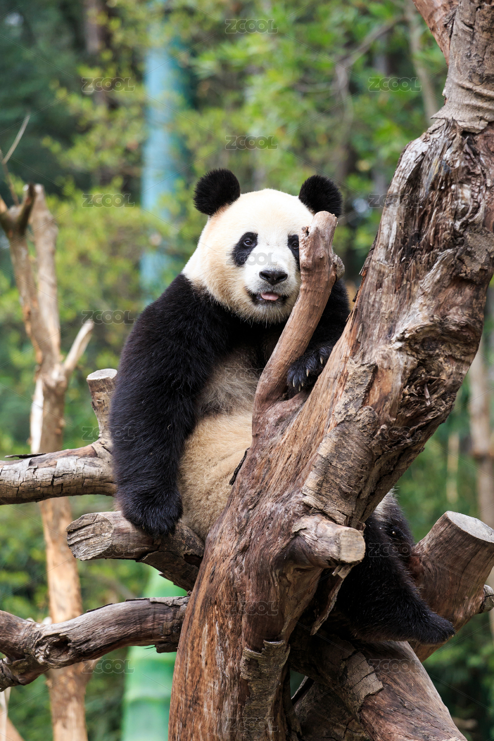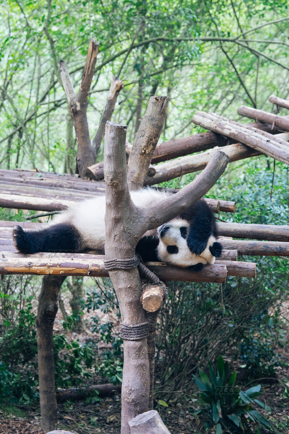 中国四川熊猫谷夏季坐躺在原木上的大熊猫