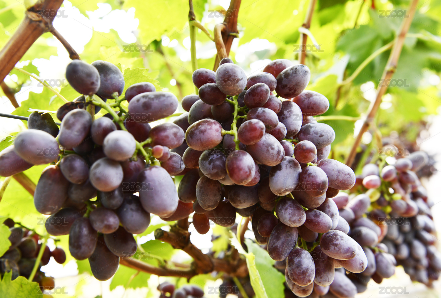 葡萄藤上挂着一串串成熟的紫色葡萄