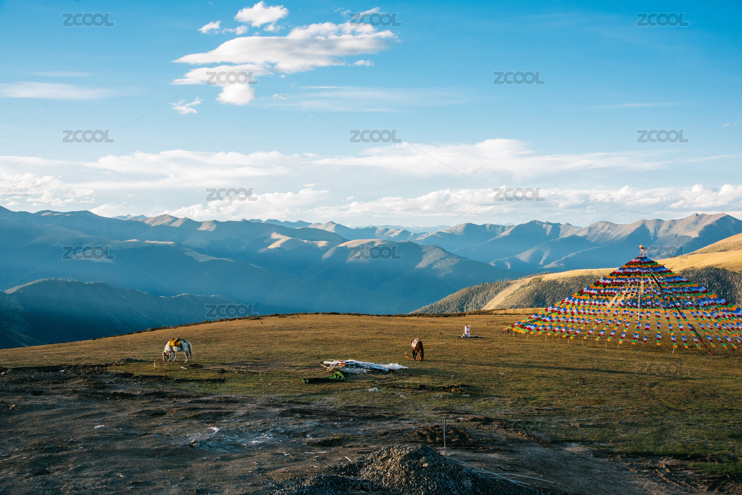 中国四川康定折多山,山顶的经幡与牧马