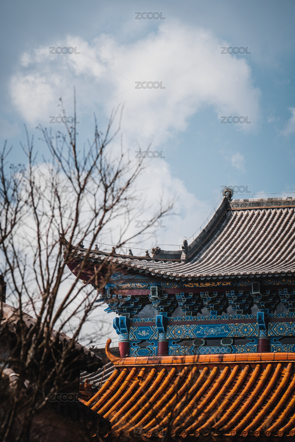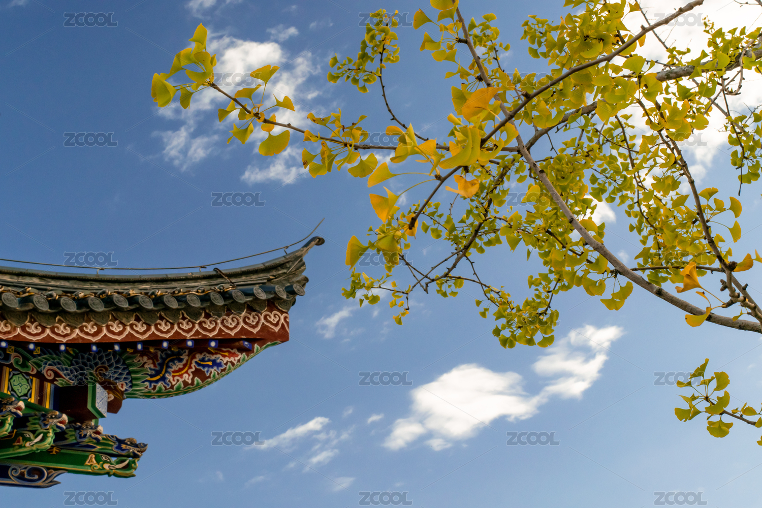 蓝天下深秋温暖的阳光照在中国古典建筑的屋顶和树叶上