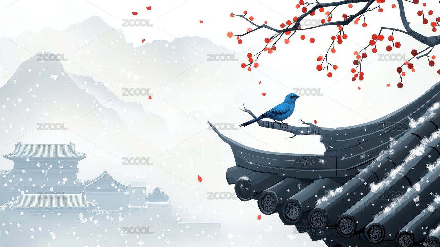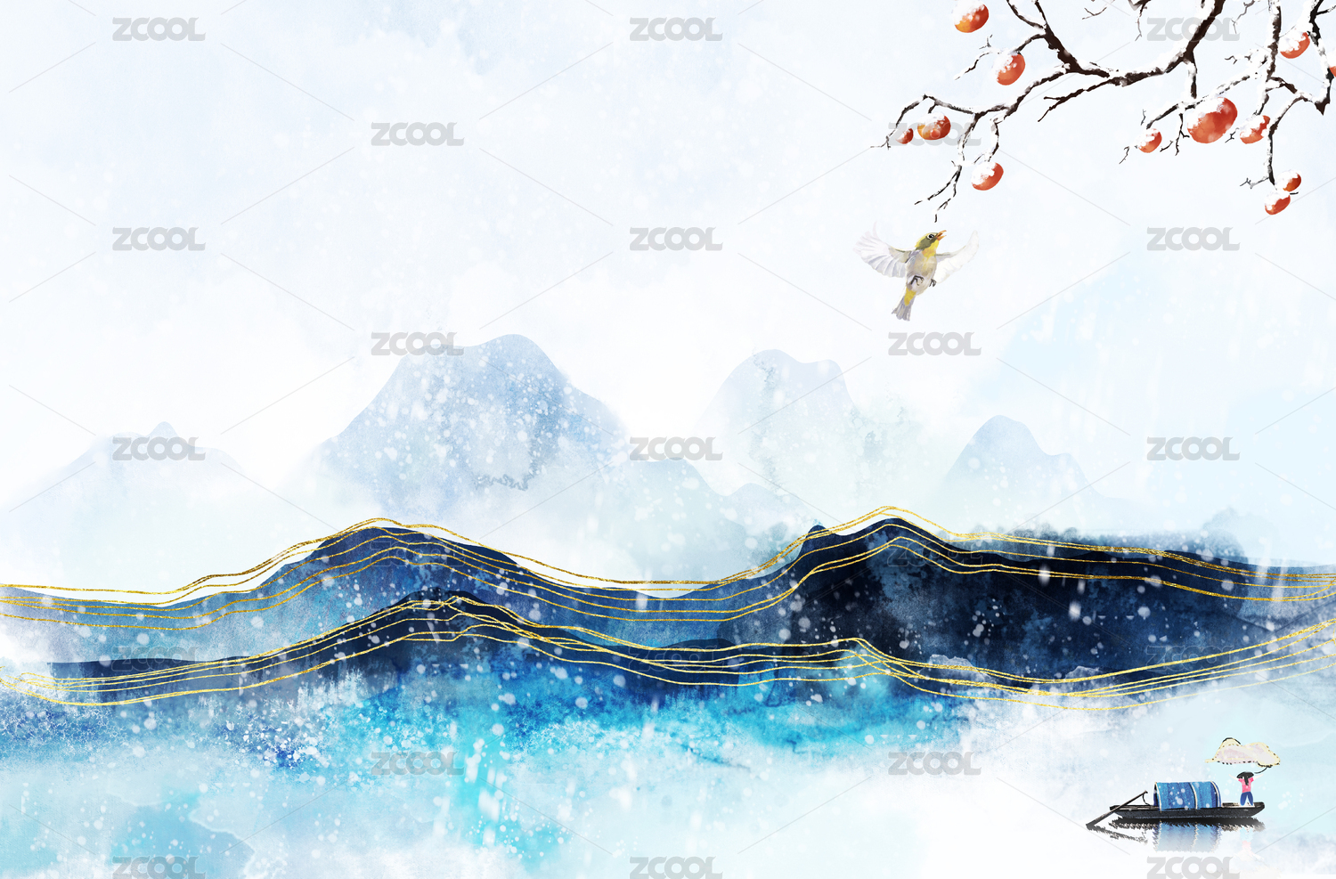 古风冬天柿子水墨山水画新中式鎏金线条山水