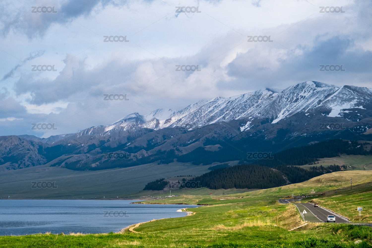 中国新疆博乐市赛里木湖畔天山山脉山麓景观