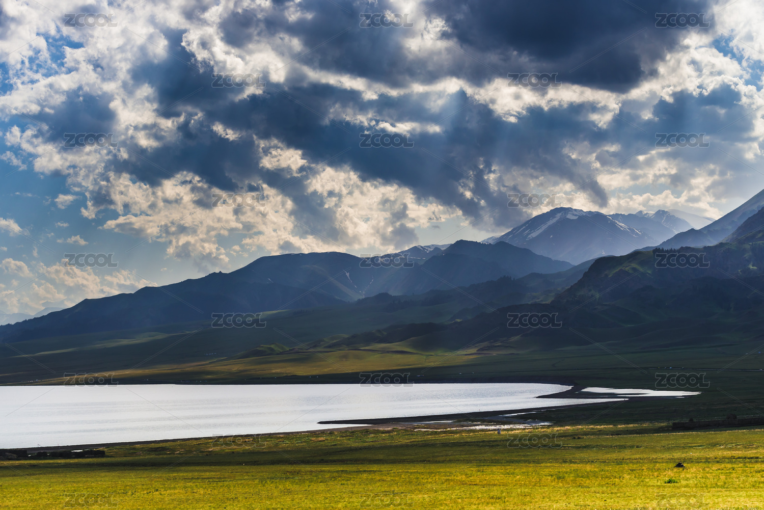 白云,草场,草原,风景名胜,湖泊,湖水,牧场,赛里木湖,山峦,新疆