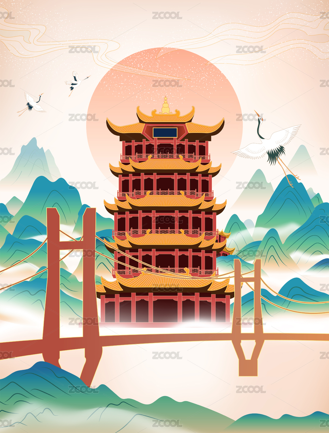 国潮中国风湖北武汉黄鹤楼地标建筑插画