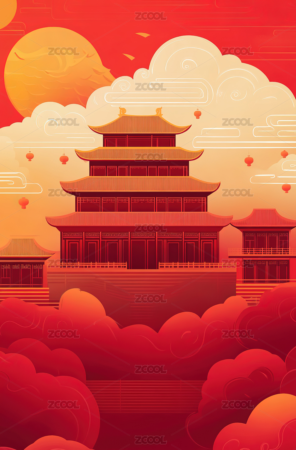 红色调中国古建筑插画