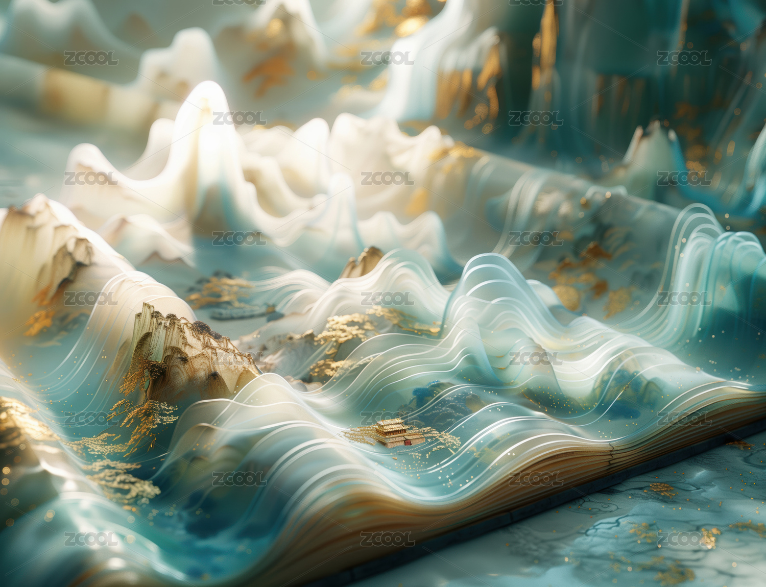 云雾,玉石,金光,山峰,玉山,缭绕,光影,卷轴,书卷