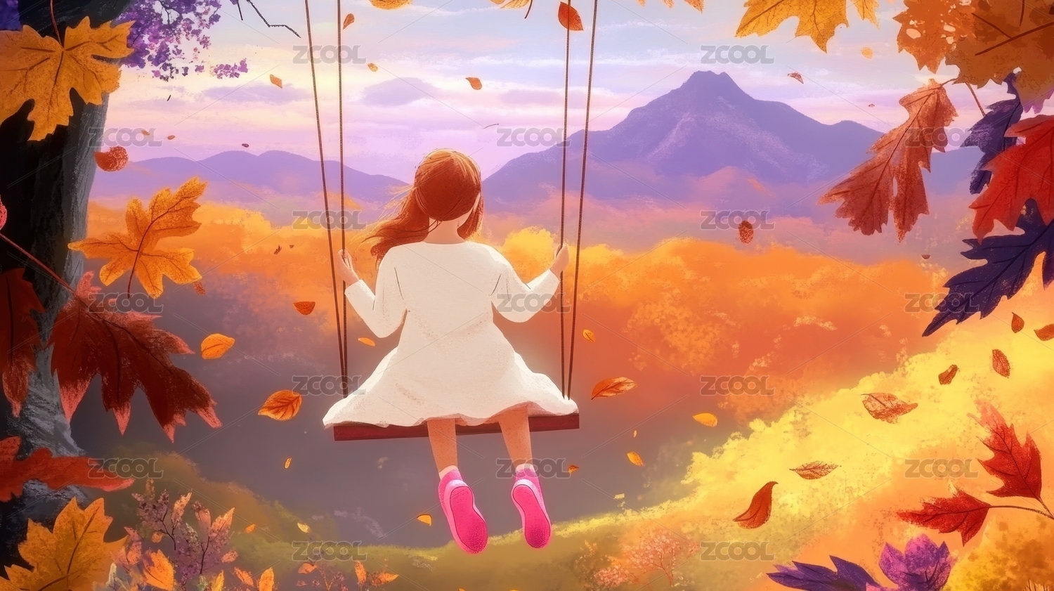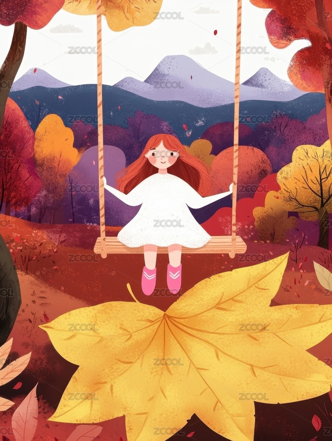 秋千上的女孩和落叶纷飞的山峦