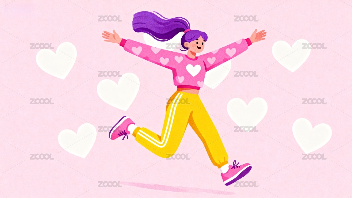 穿着短裙的长发性感美丽少女和粉色方块圆点图形的背景插画