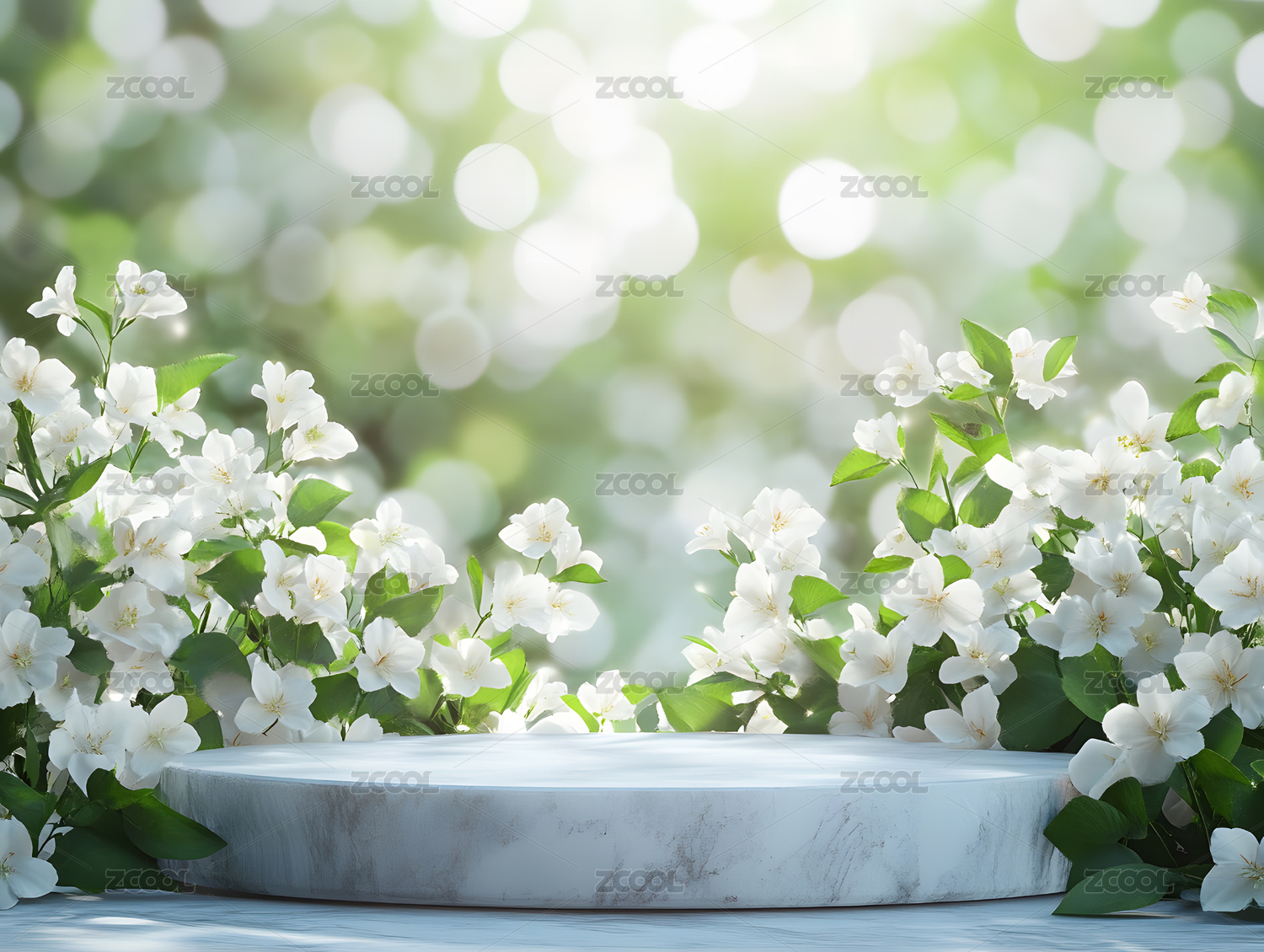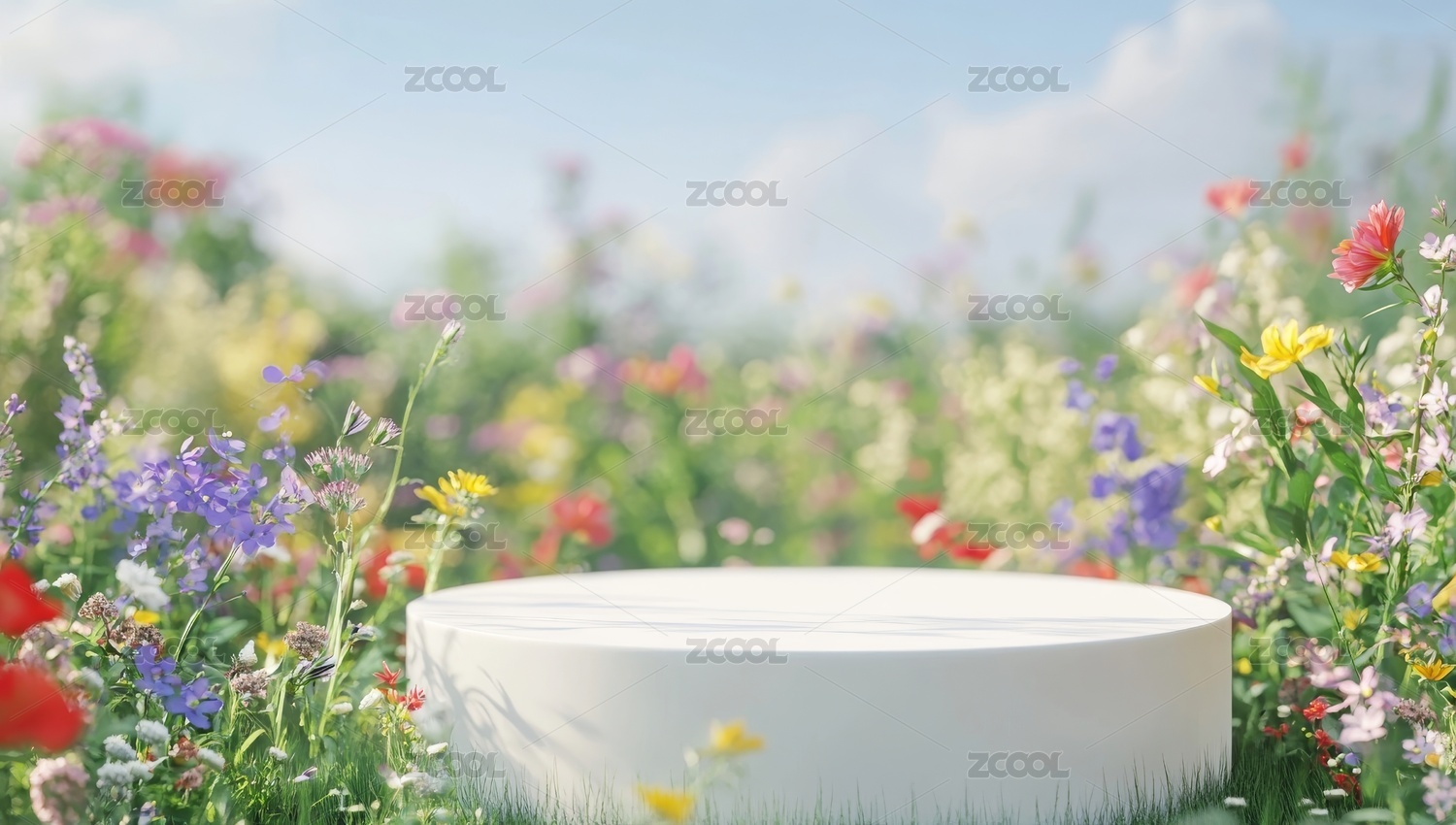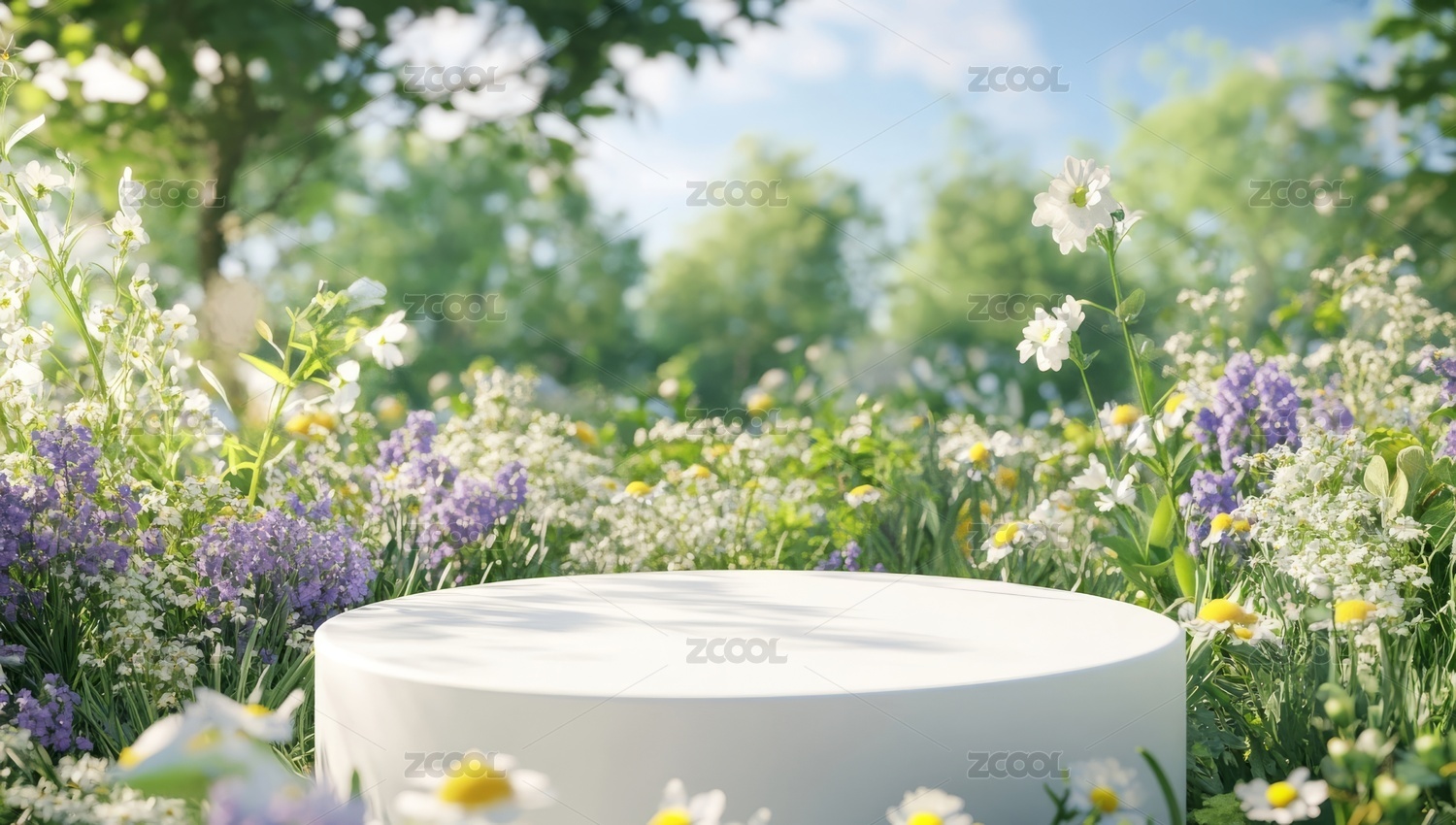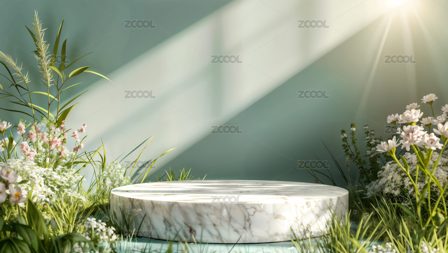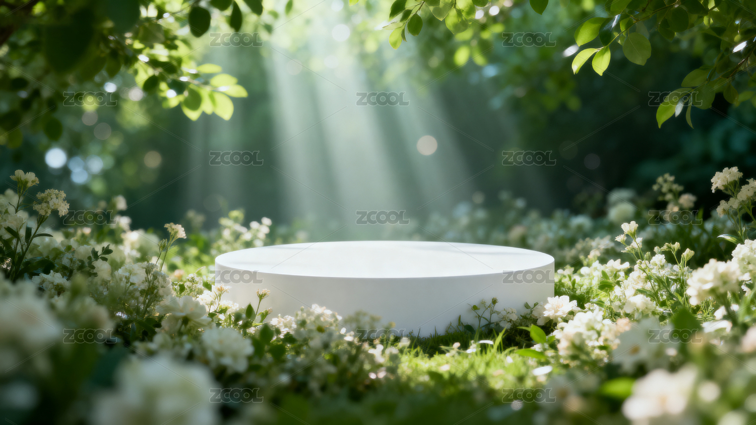绿色环保清新花朵绿叶围绕中的圆形展示台