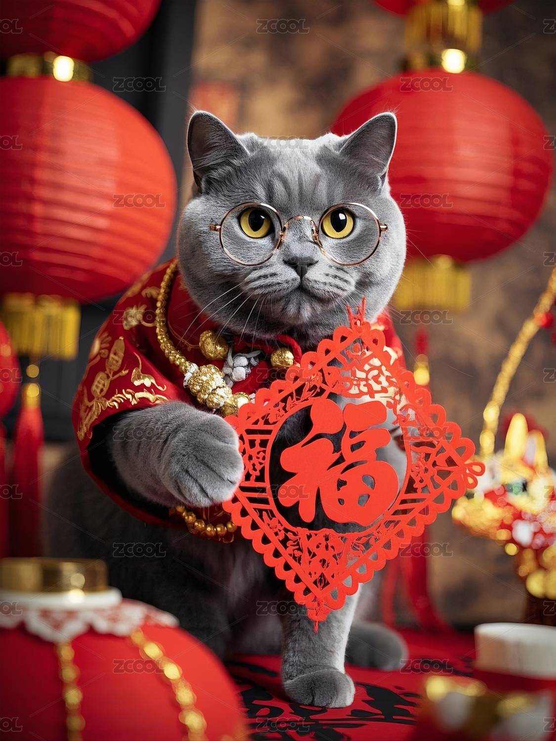 新年拿着福字站在灯笼前戴着眼镜的蓝猫