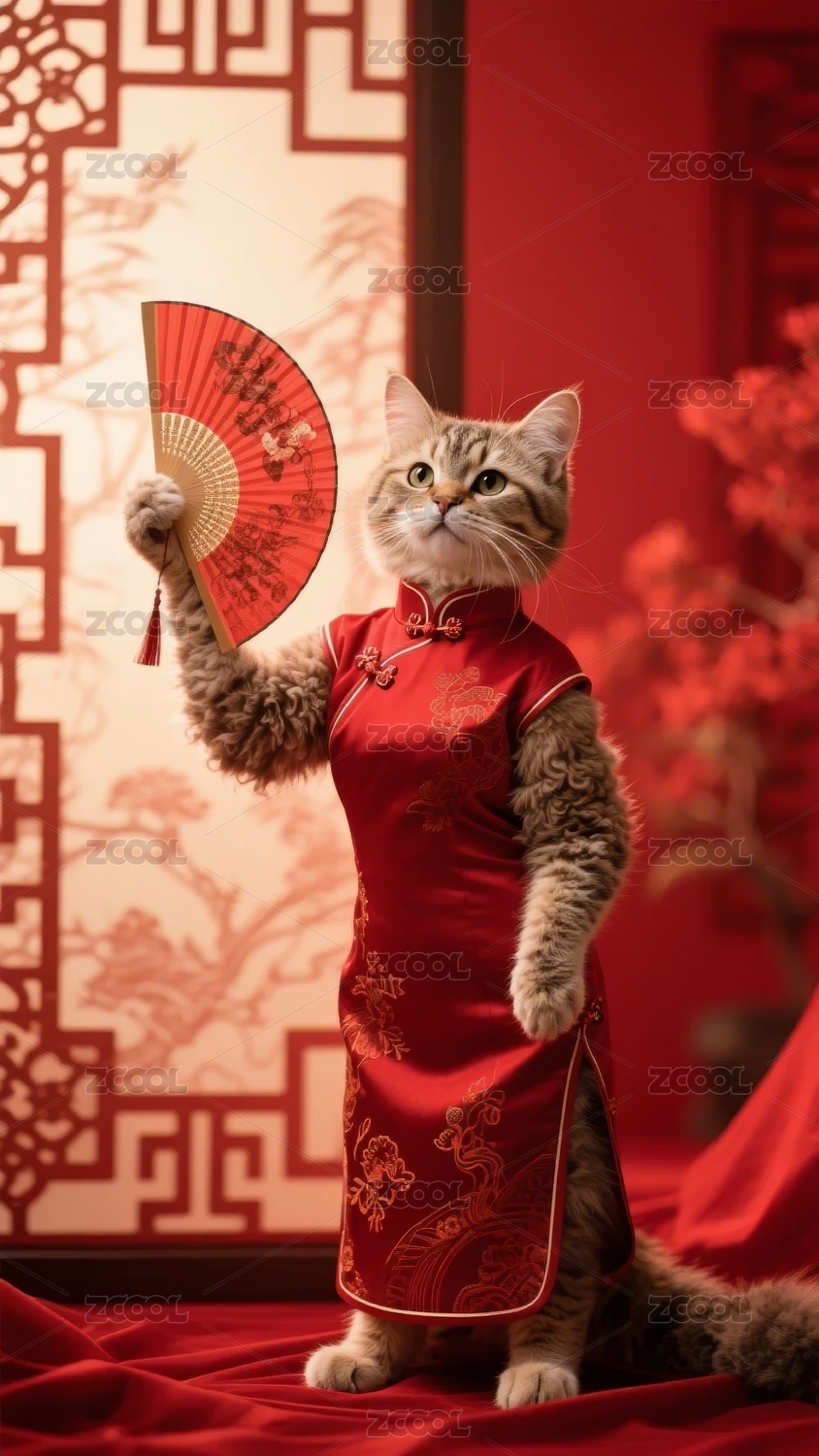 猫咪身着红色旗袍手持折扇