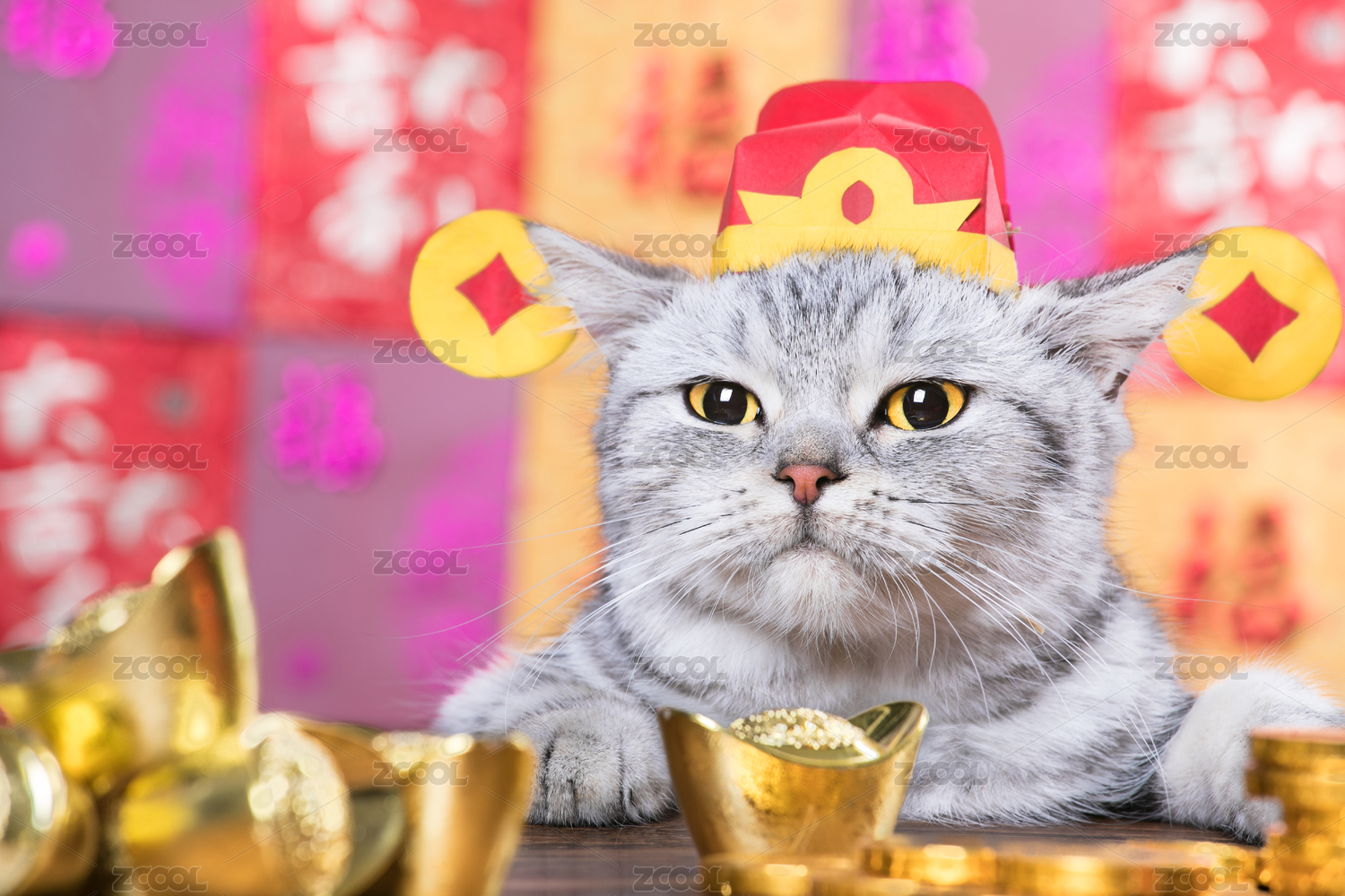 戴财神帽子的猫和元宝金币