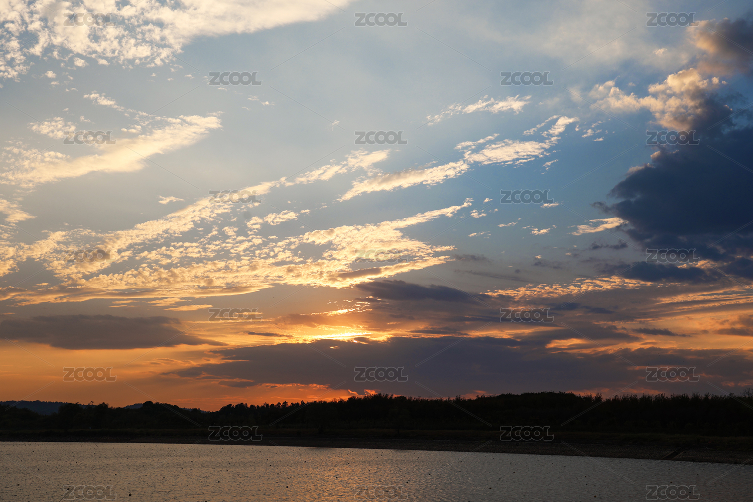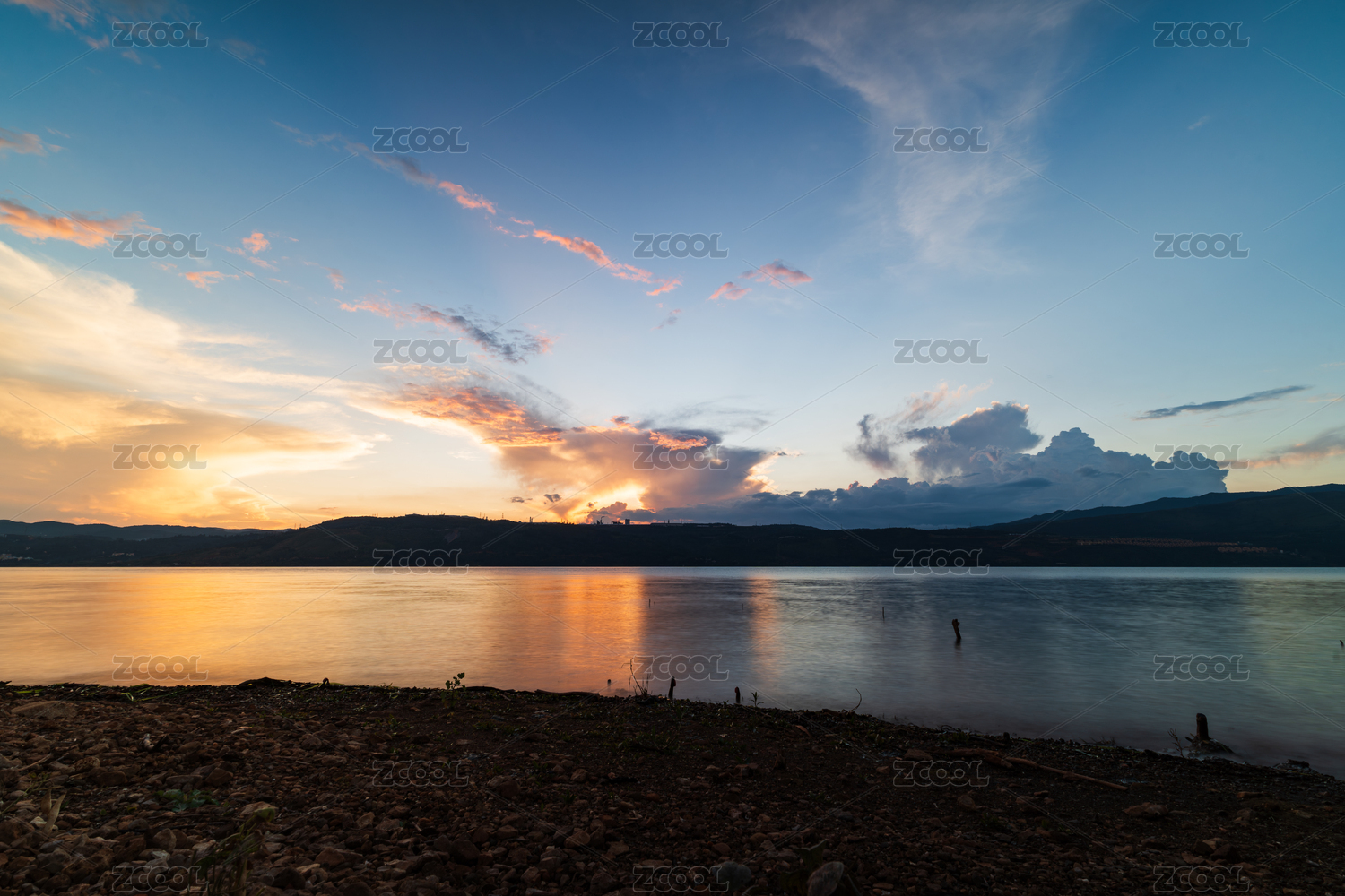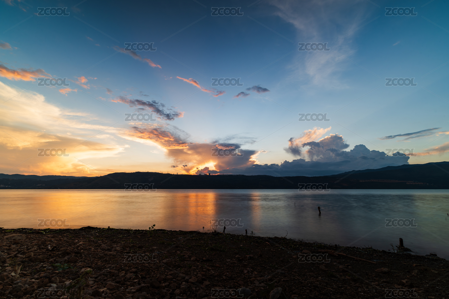 湖畔黄昏时色彩绚烂的天空景象