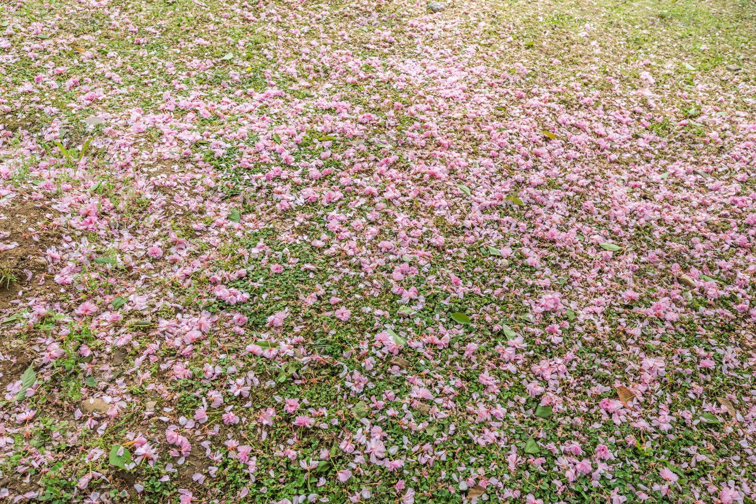 雨后,落花,粉色,草地,公园,椅子,休息区,木墩,李子,李