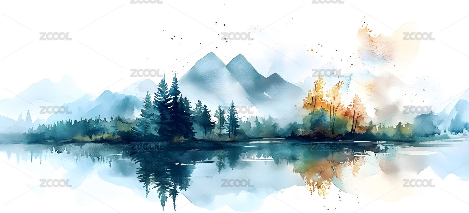 水彩风格森林湖泊
