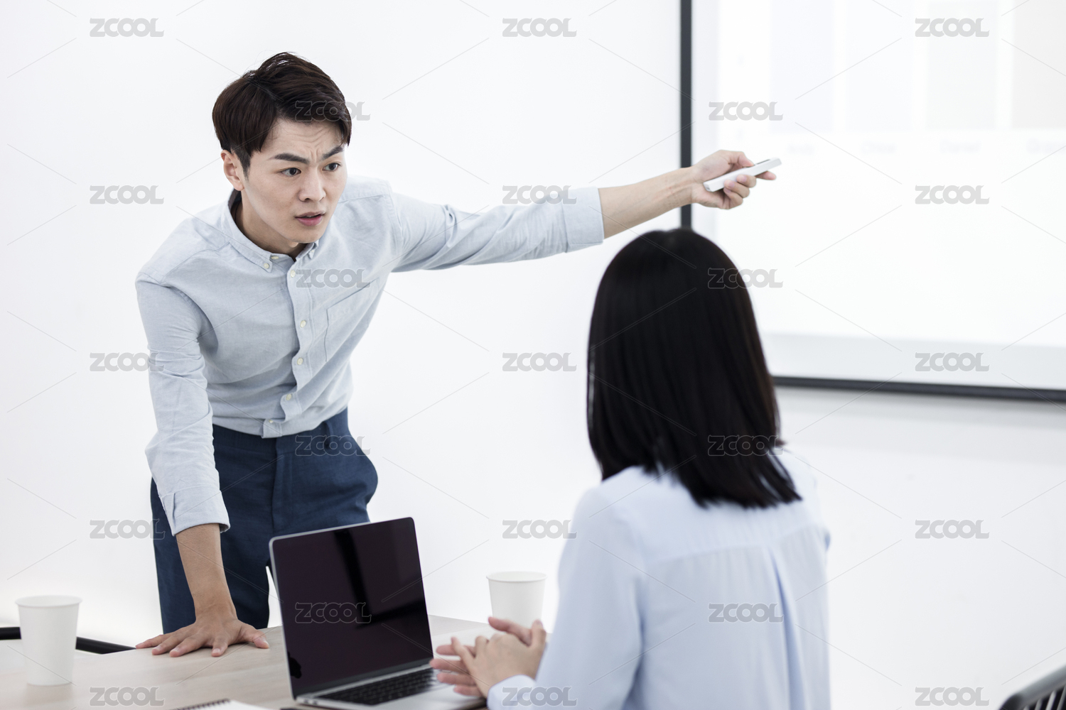 会议室内两名职员在讨论工作