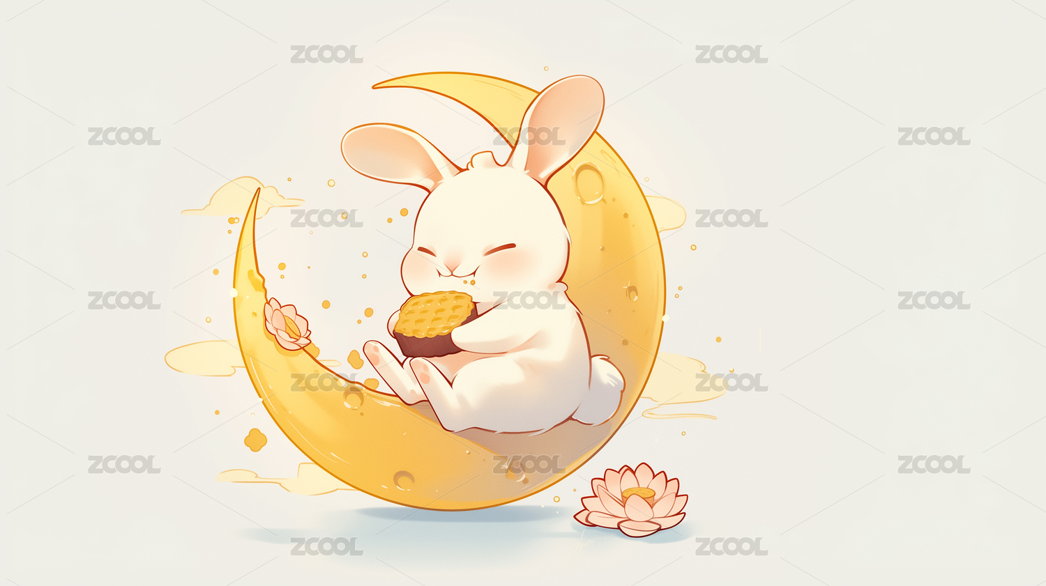 可爱小兔子抱着月饼花朵中秋节水彩插画