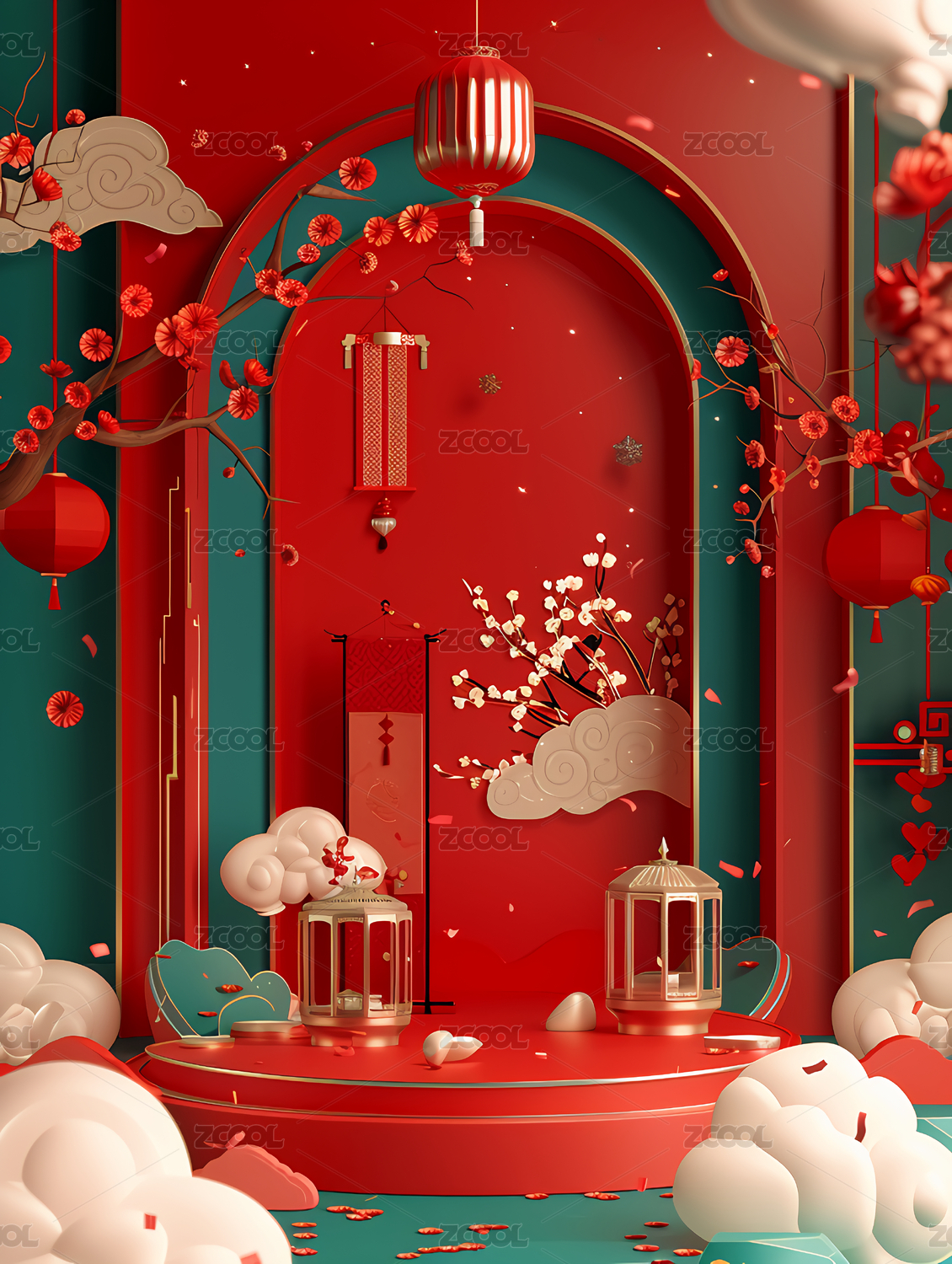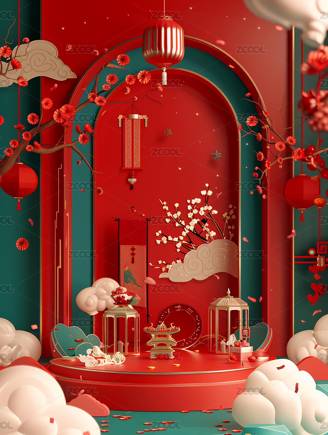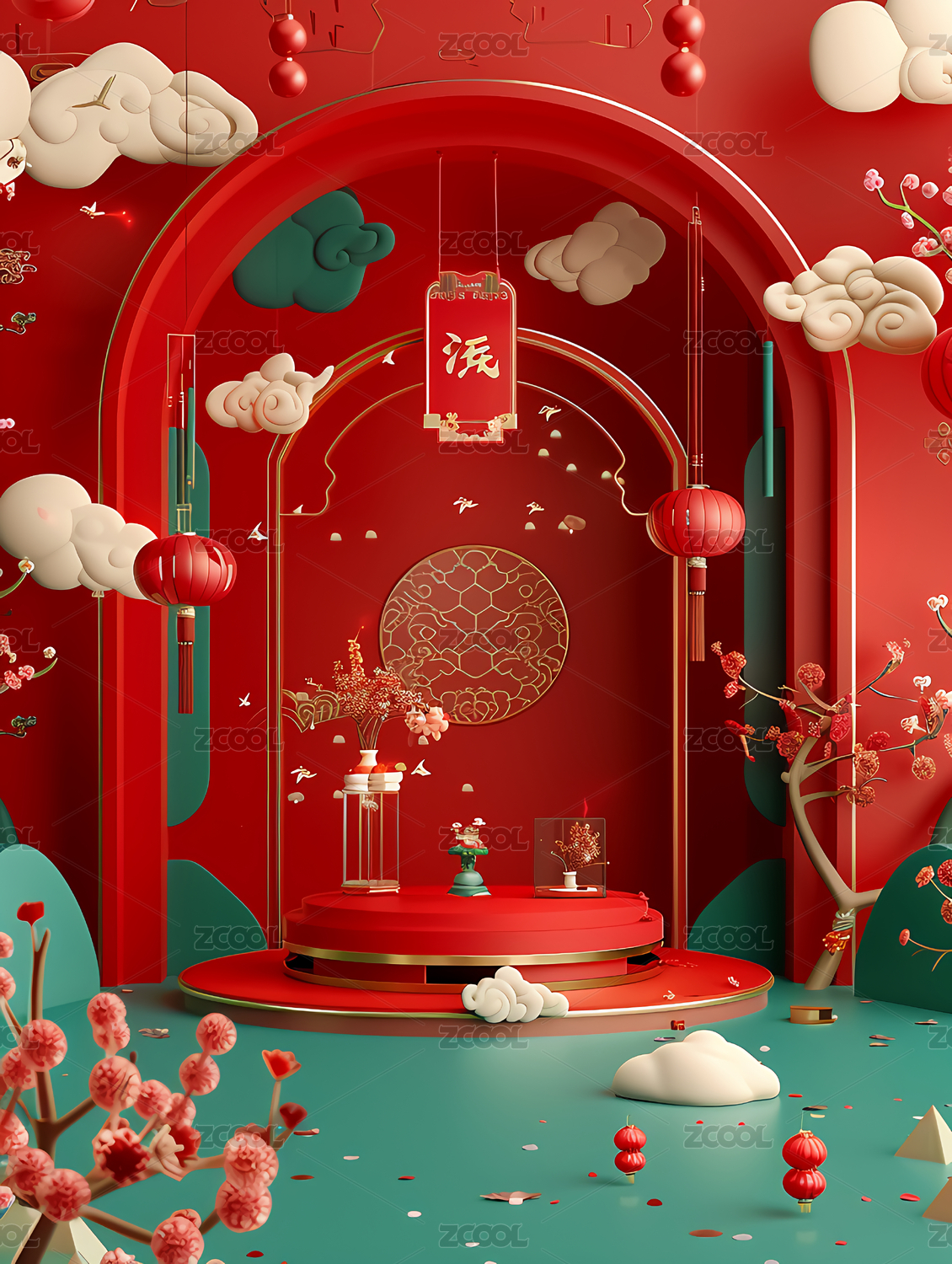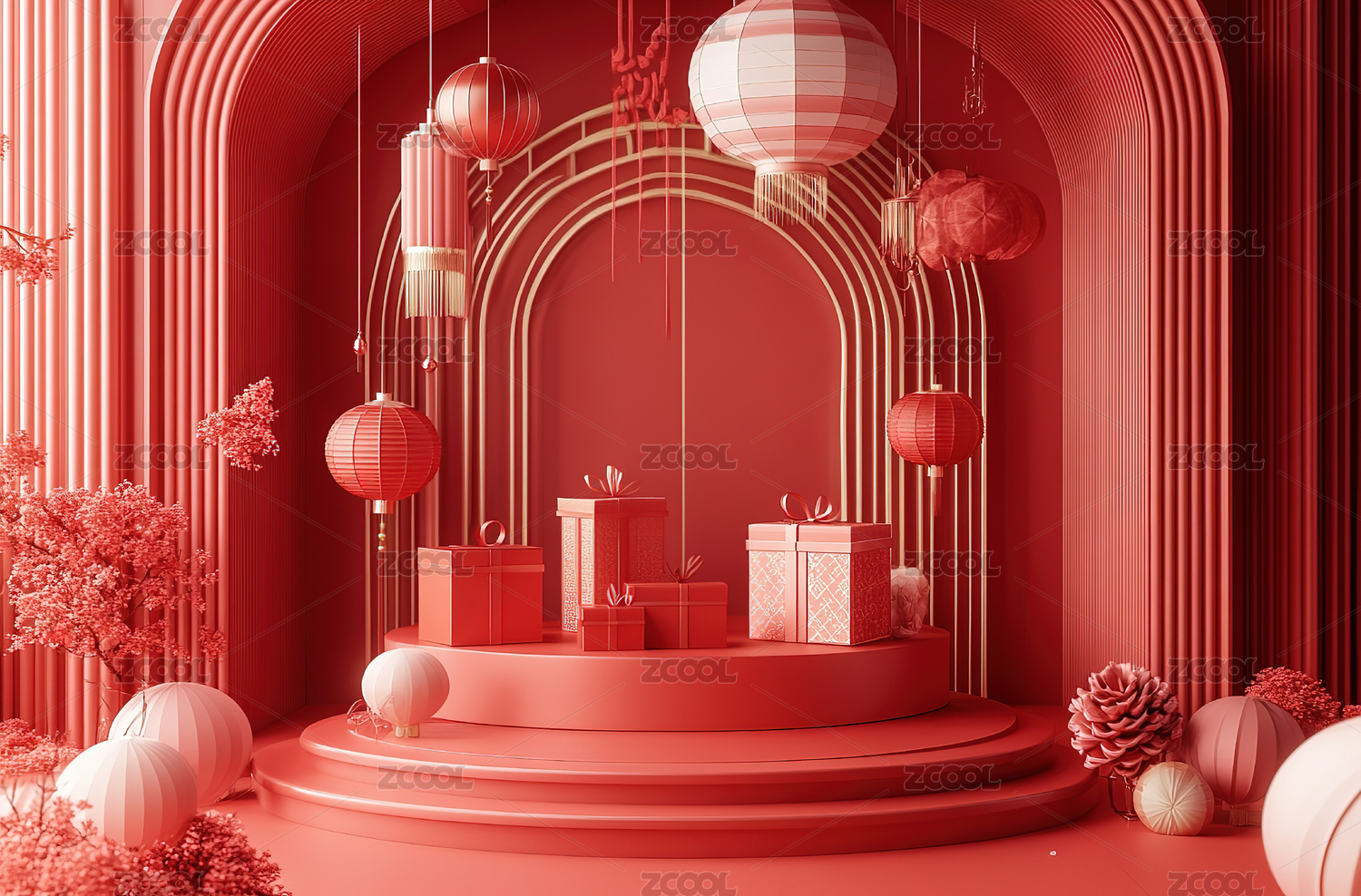 国风,国潮,三维,场景,舞台,静物,节日,购物节,红色,喜庆