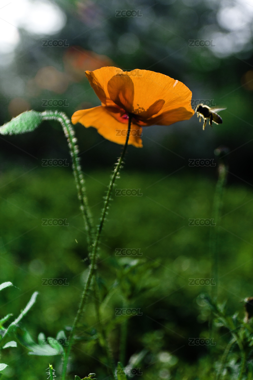 暗背景中的花卉黄色野罂粟及飞行中的小蜜蜂特写