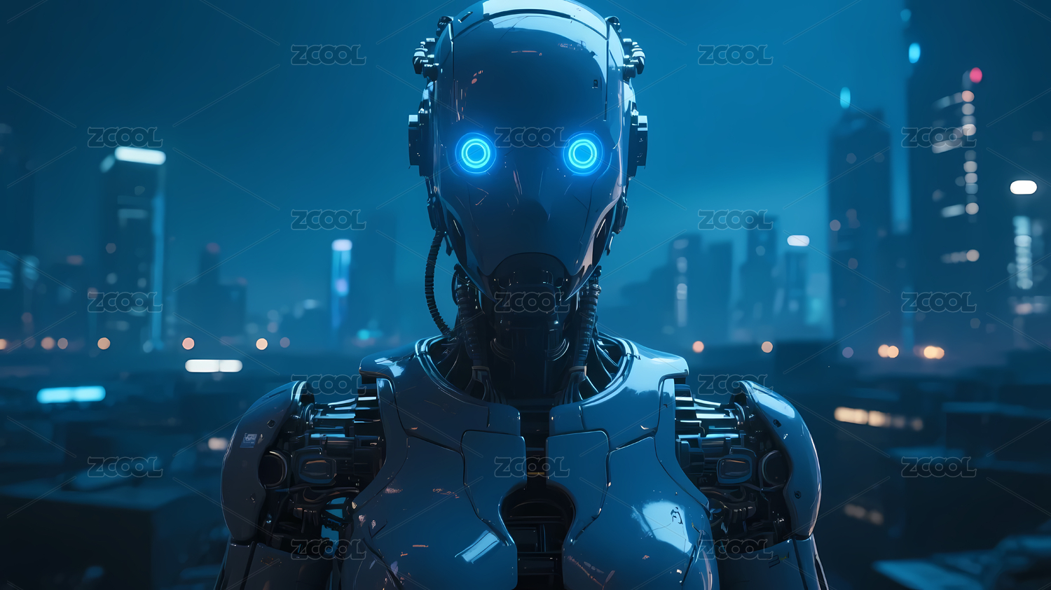 蓝色眼睛机器人与城市景观