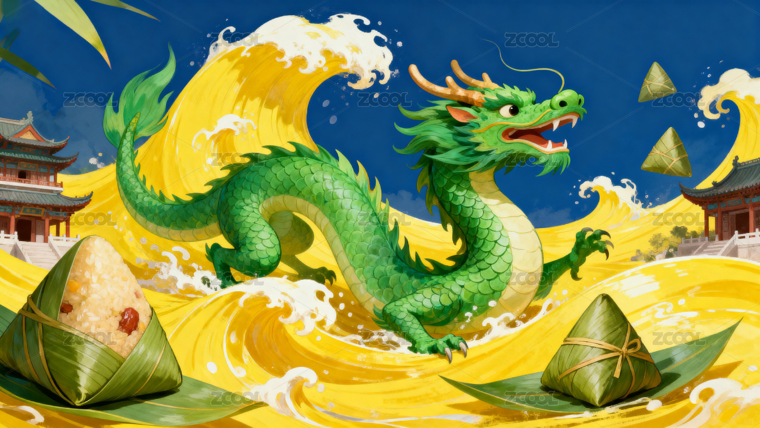 国潮端午节青龙绿水翔云围绕着粽子横版