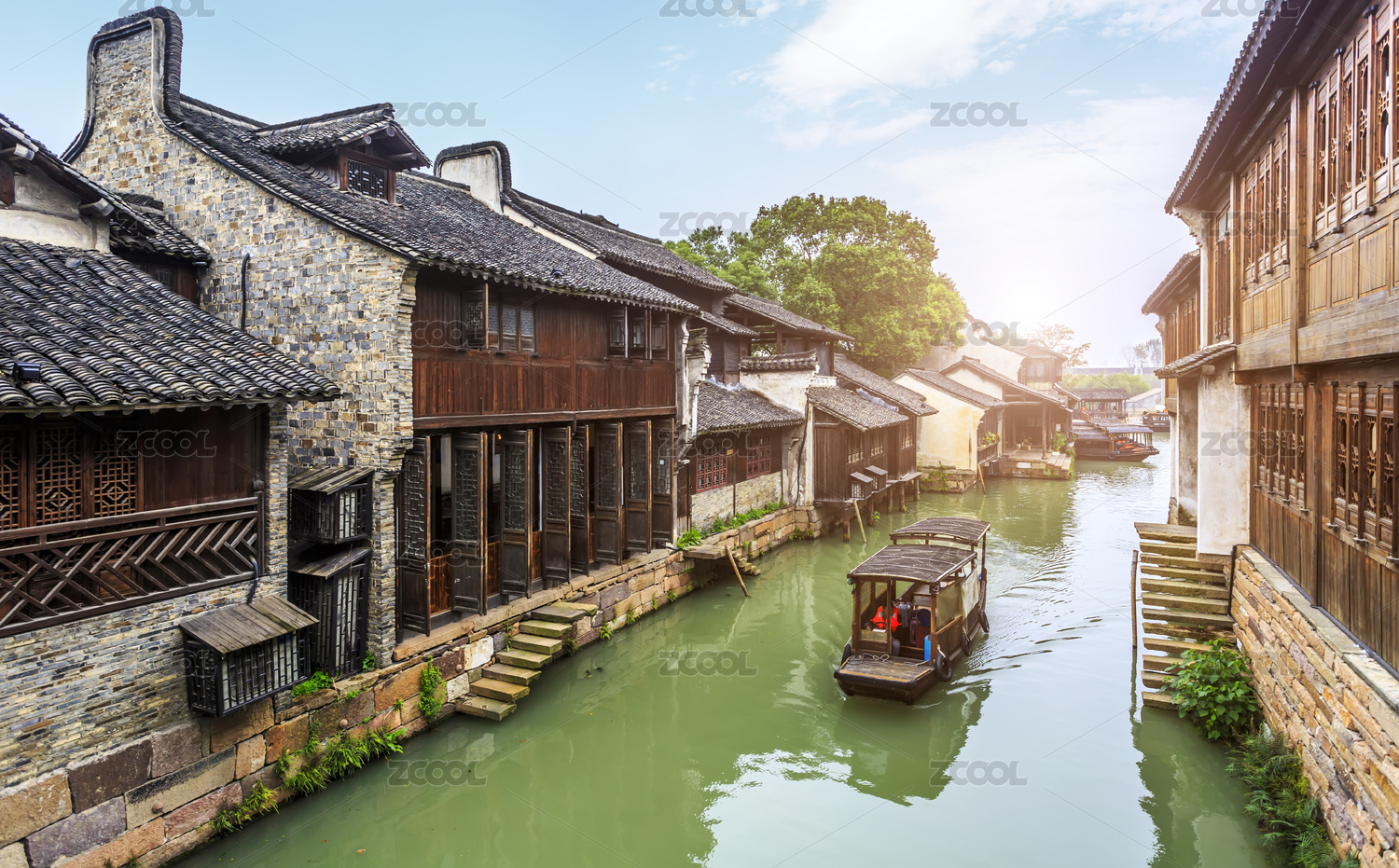 浙江,乌镇,古镇,江南水乡,古建筑,春天,蓝天白云,乌篷船,游船,画