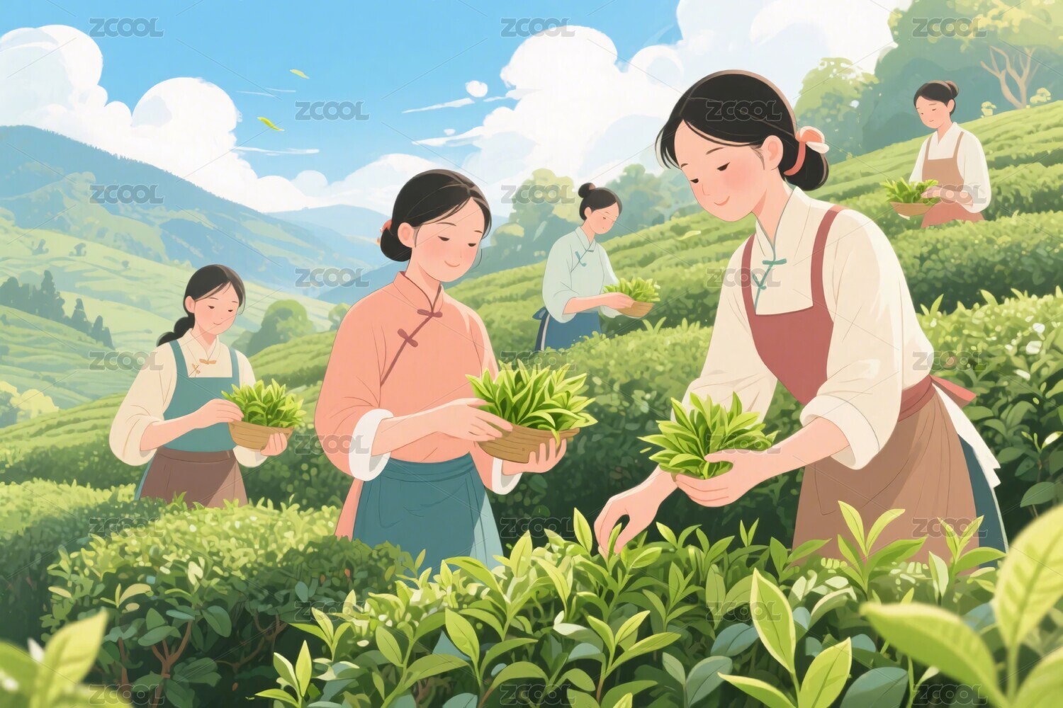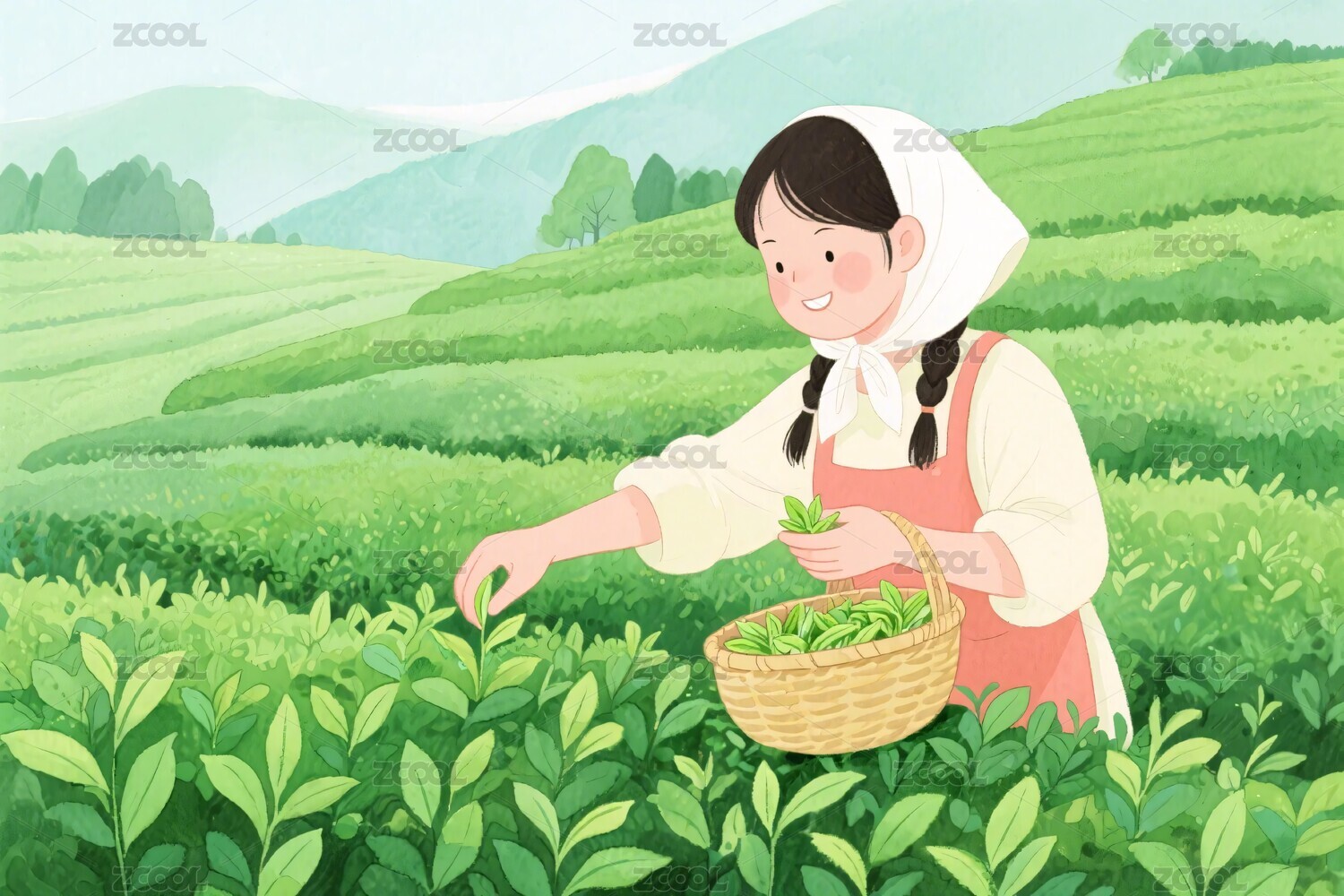 采茶,茶叶,姑娘,人,插画,美女,绿色,农业,女人,户外