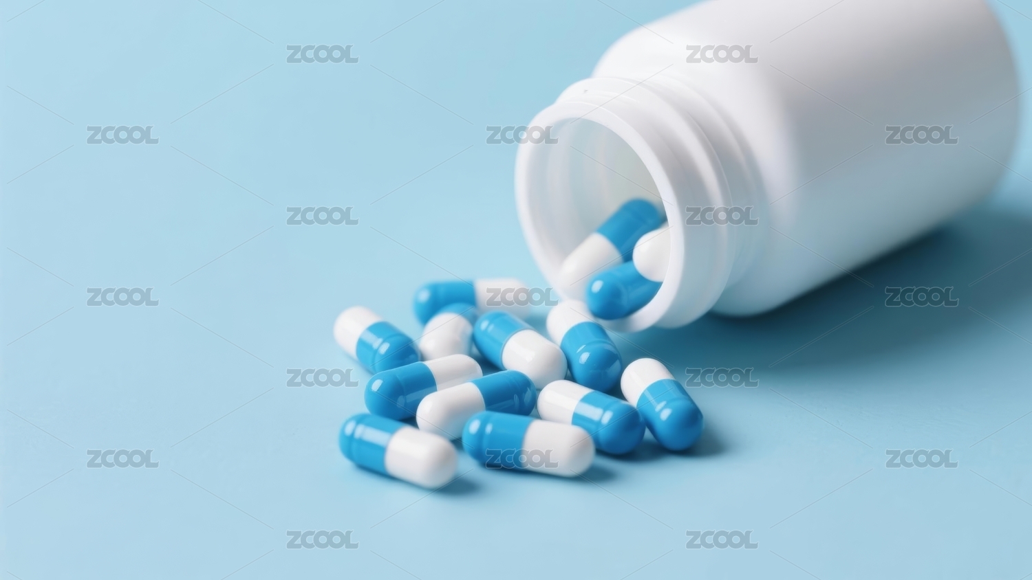 蓝白药丸从瓶中散落