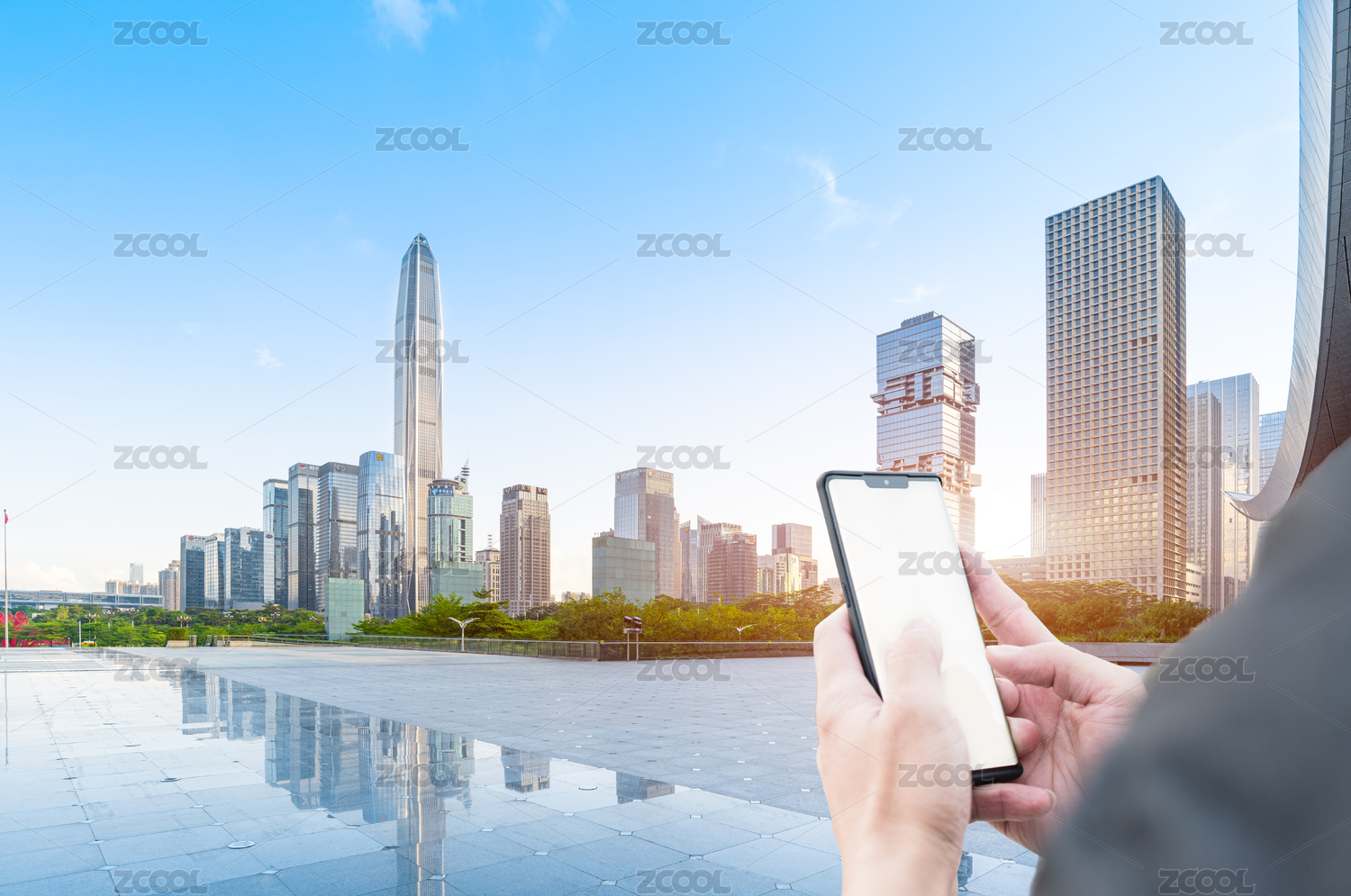 深圳市民中心广场和拿着手机的手