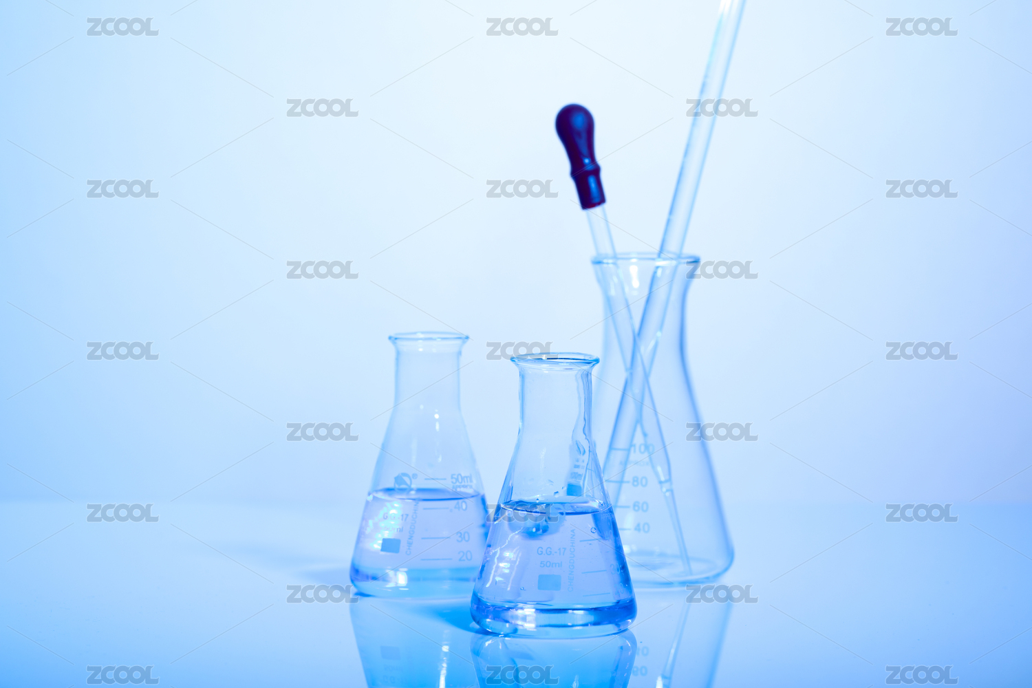 蓝色灯光打在化学试验的各类玻璃仪器上