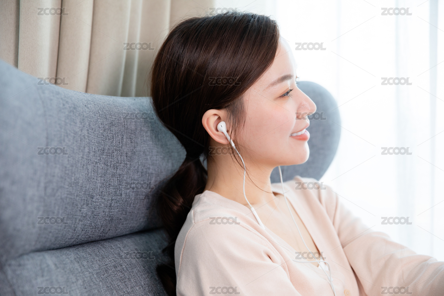 一名年轻女姓在客厅里使用无线耳机听音乐