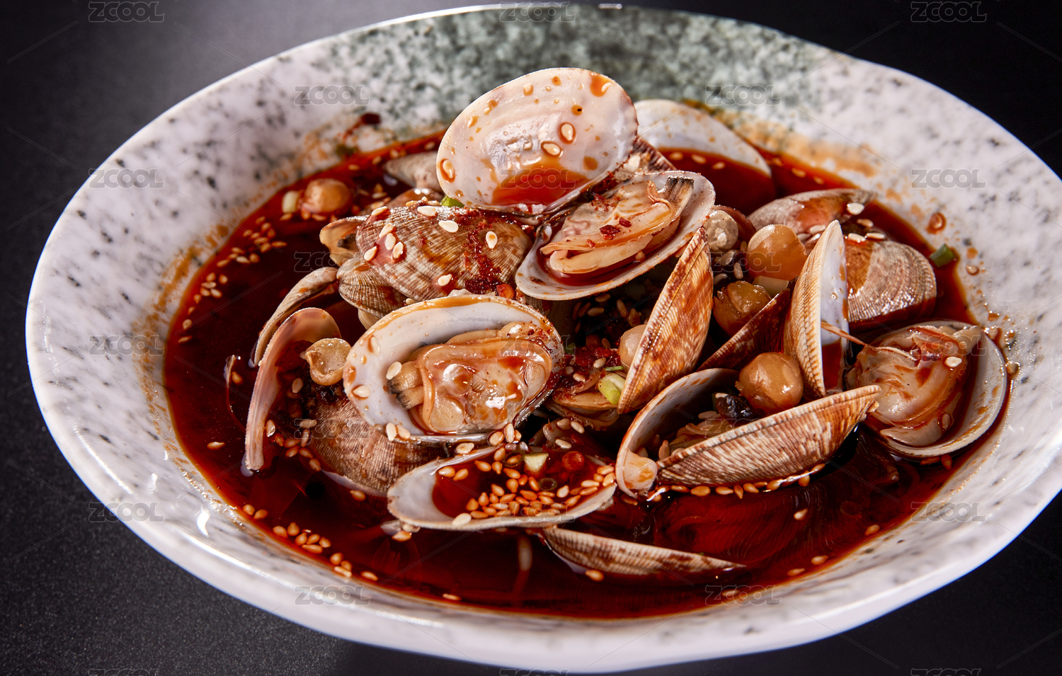 放在盘子中的海鲜麻辣花蛤