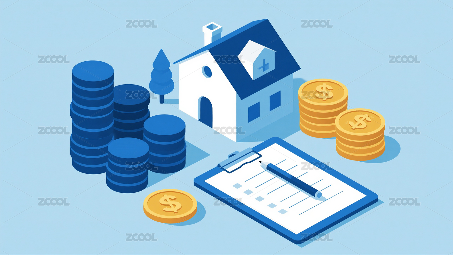 蓝白房屋模型与金币等物品伴随账簿摆放