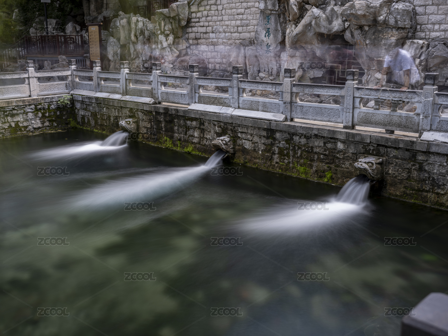 济南护城河黑虎泉泉水从石雕兽头中喷射而出