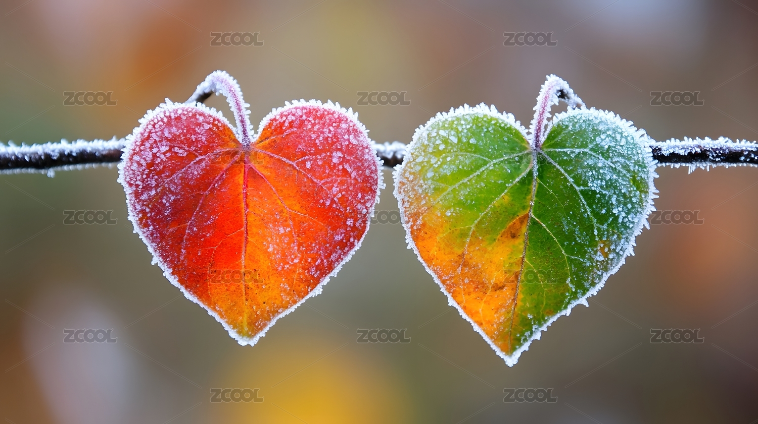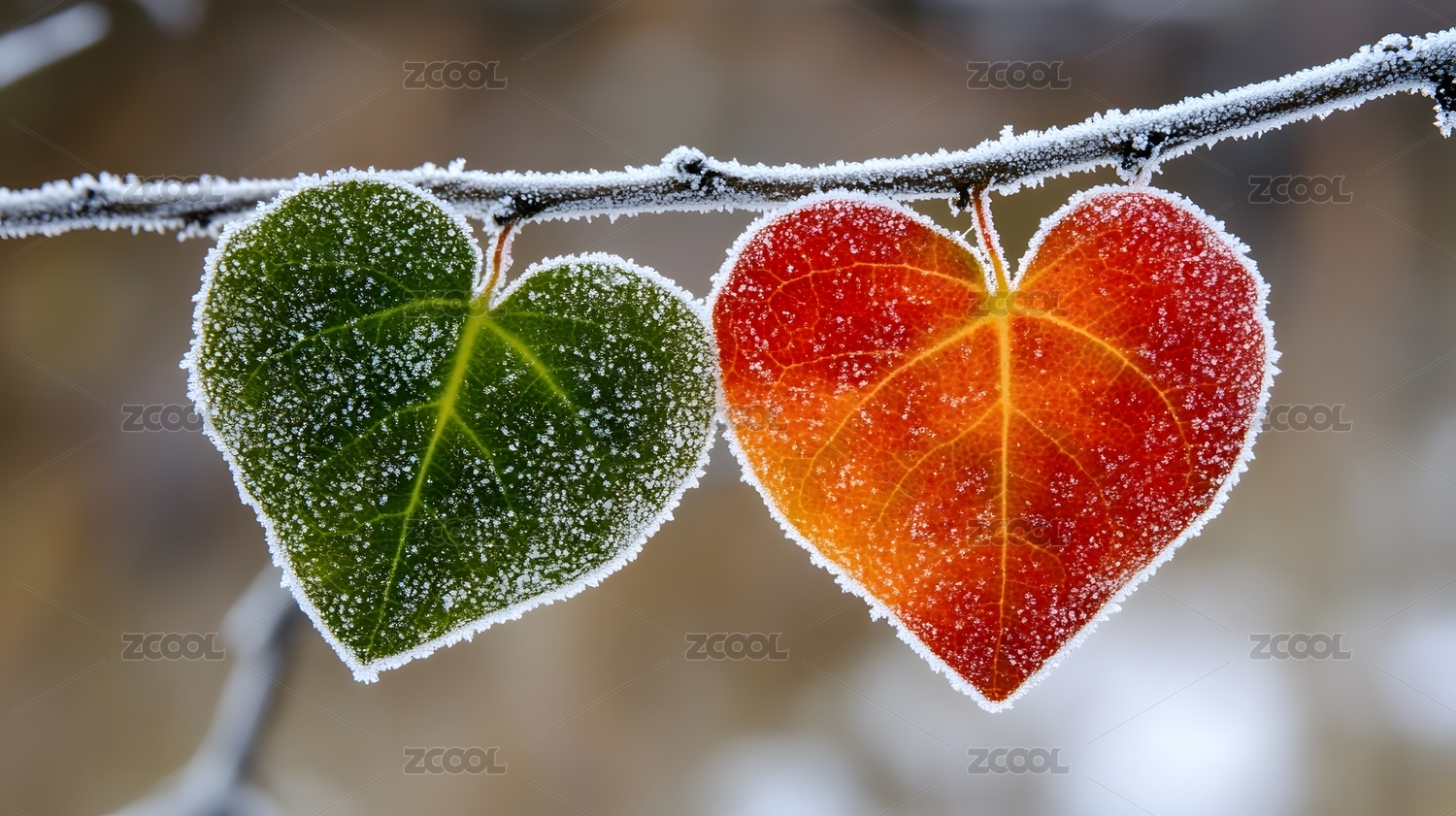 冰冻的红绿爱心树叶
