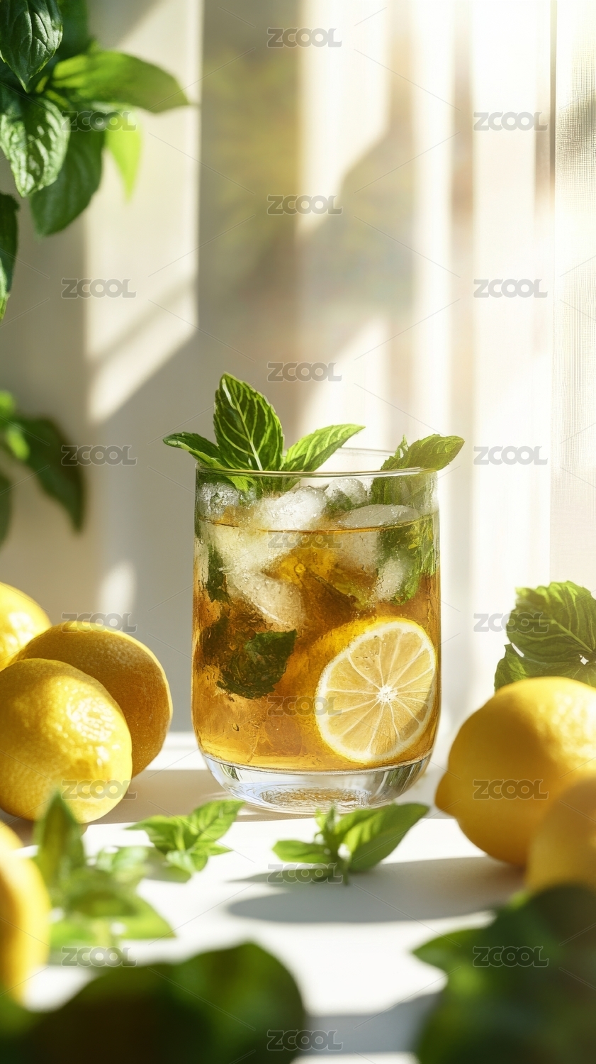 柠檬薄荷冰茶阳光下的清新饮品