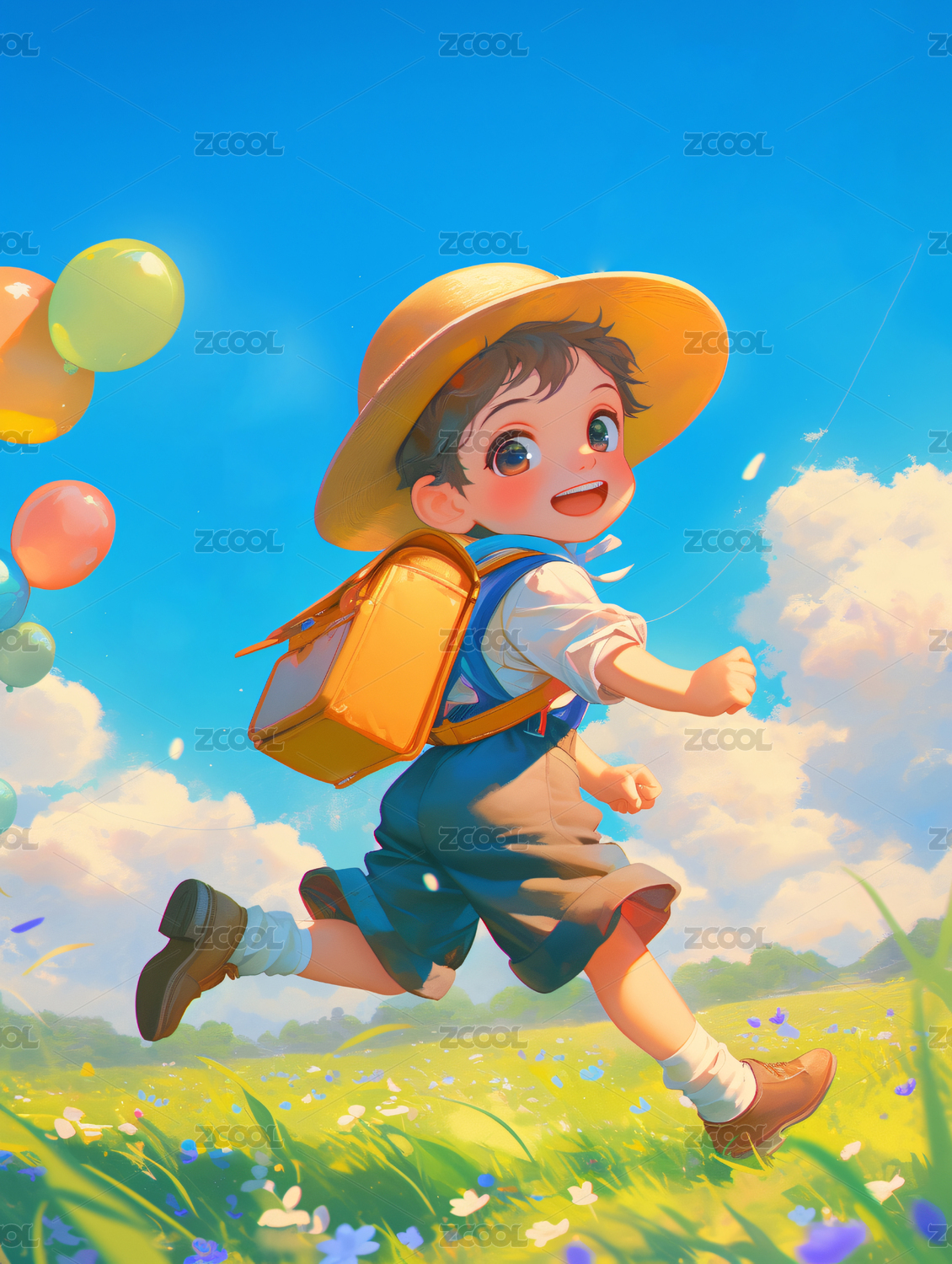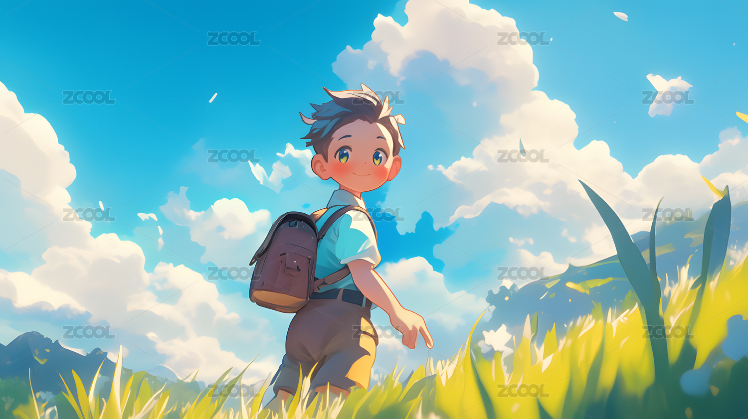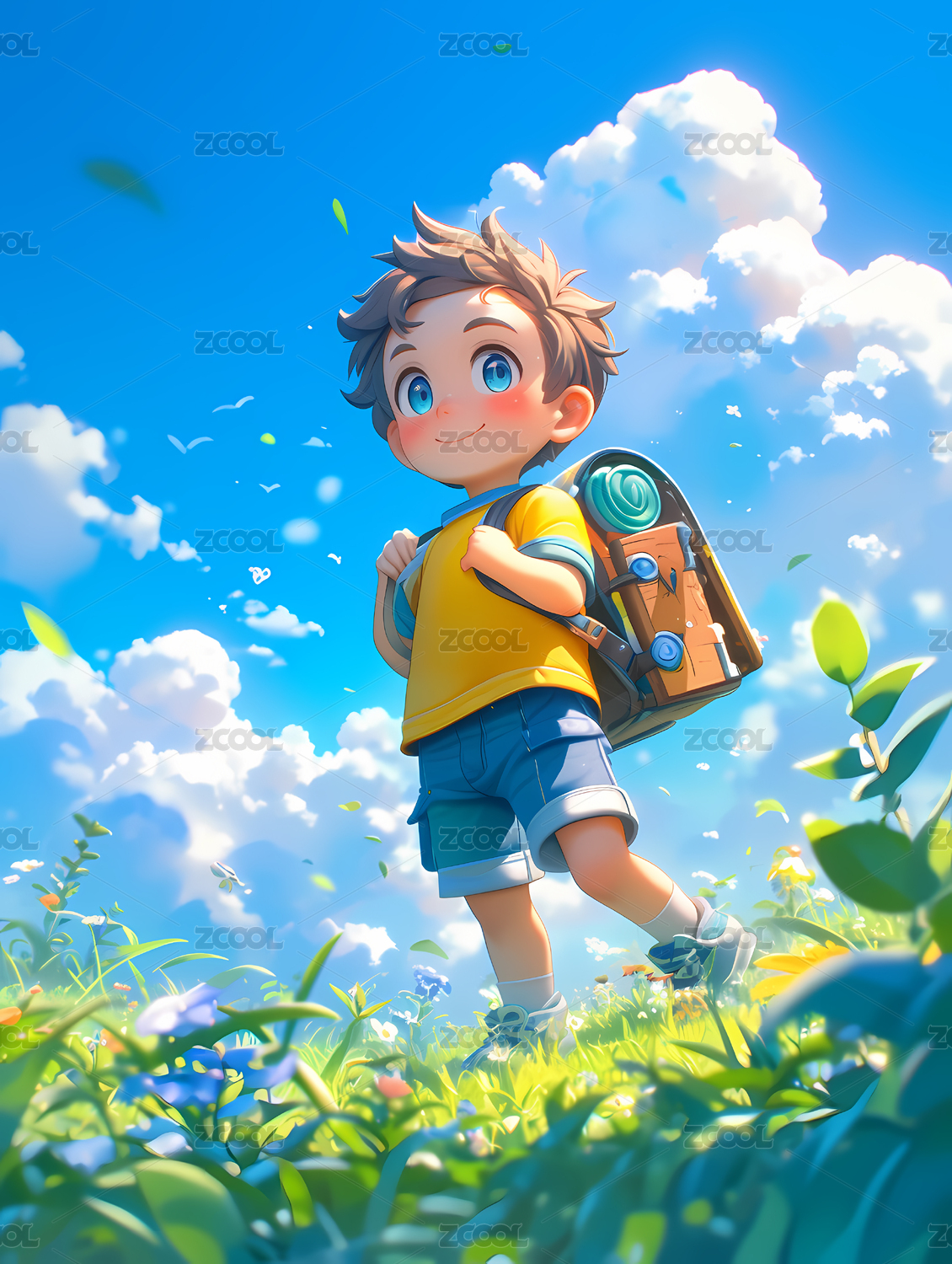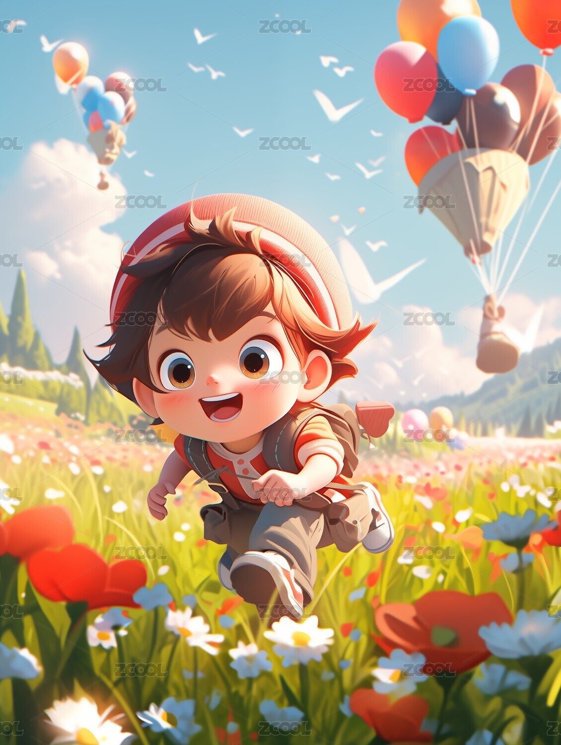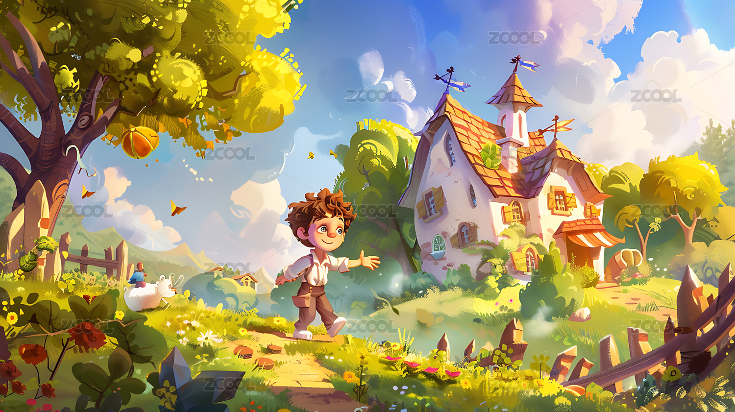 卡通可爱男孩蘑菇森林唯美治愈插画