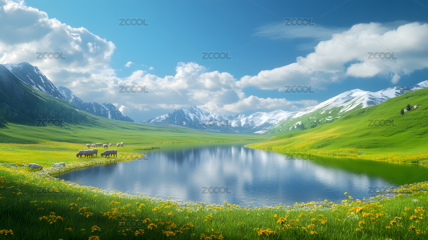 山谷湖泊草原绵羊风景