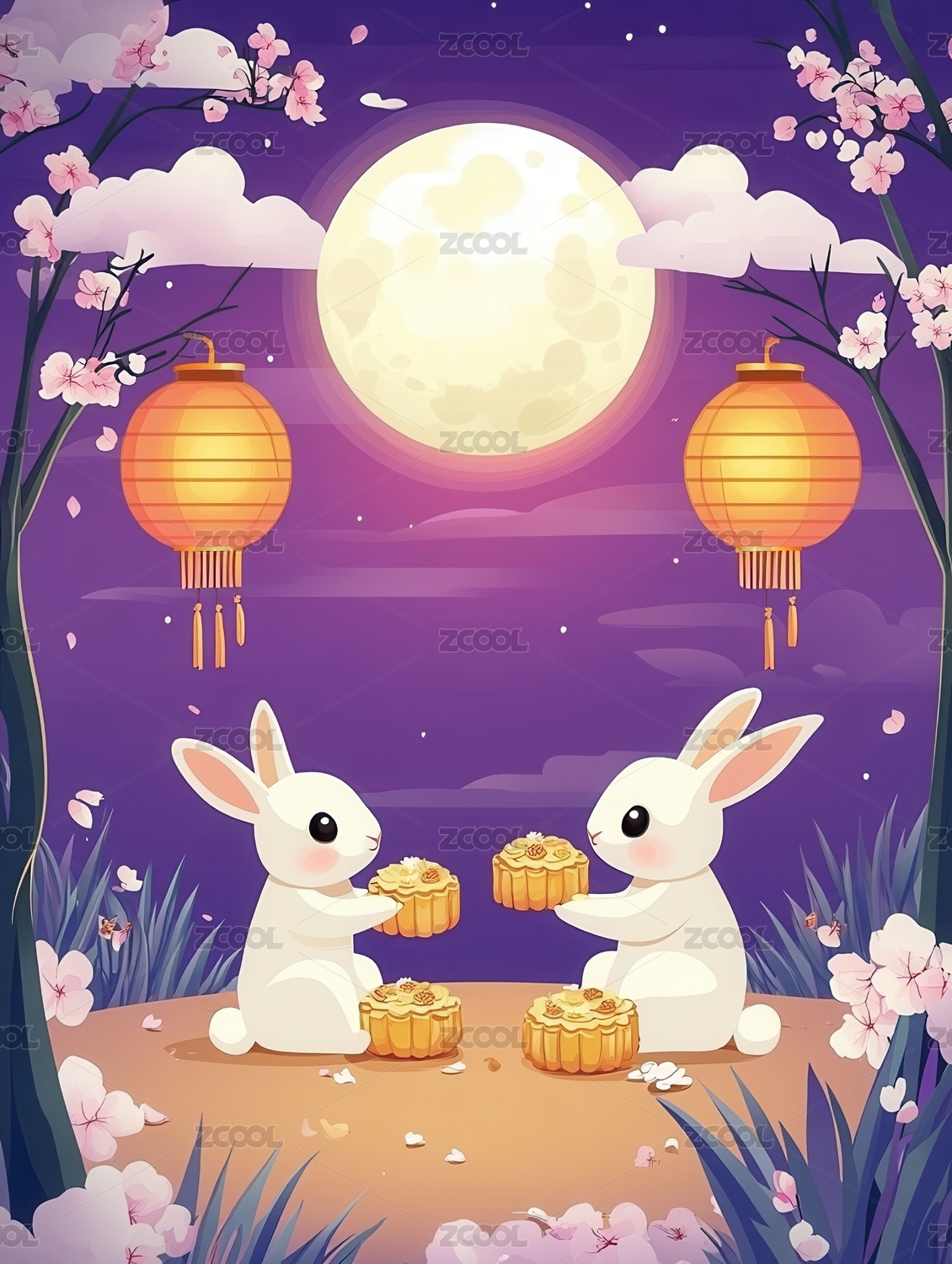 中秋节月亮玉兔抱着月饼赏月场景概念插图