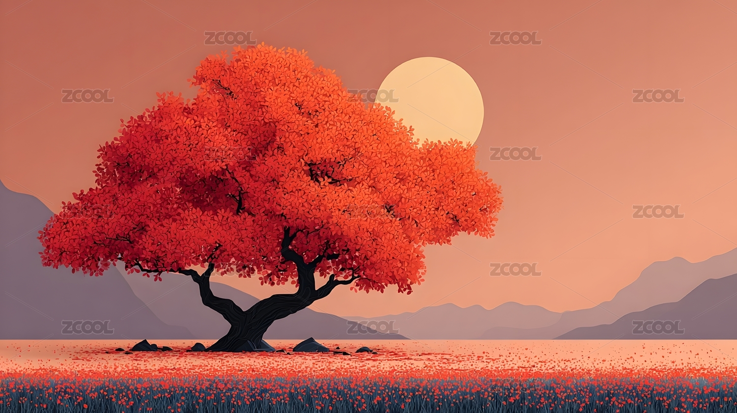 落樱缤纷山峦下的孤树