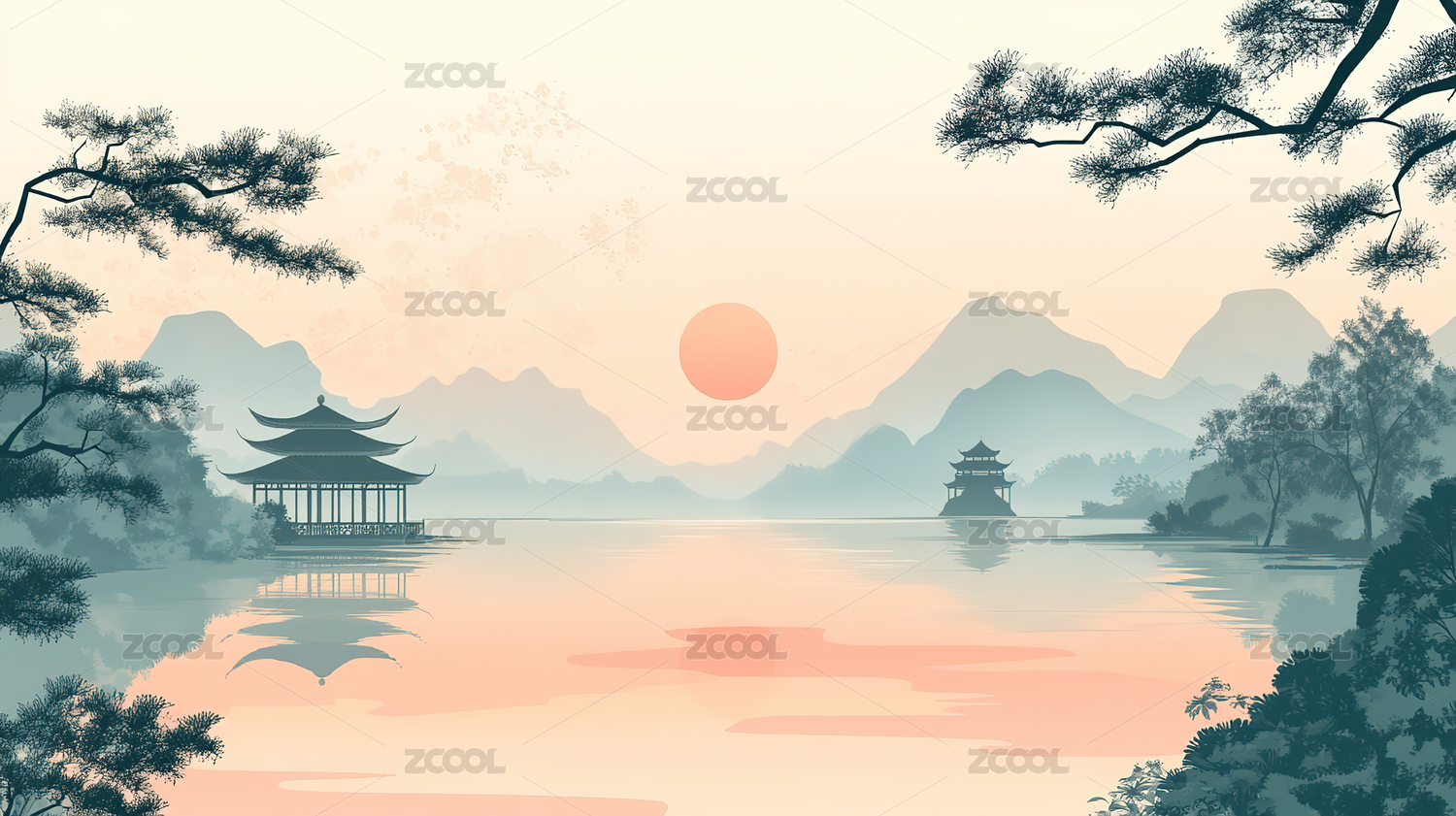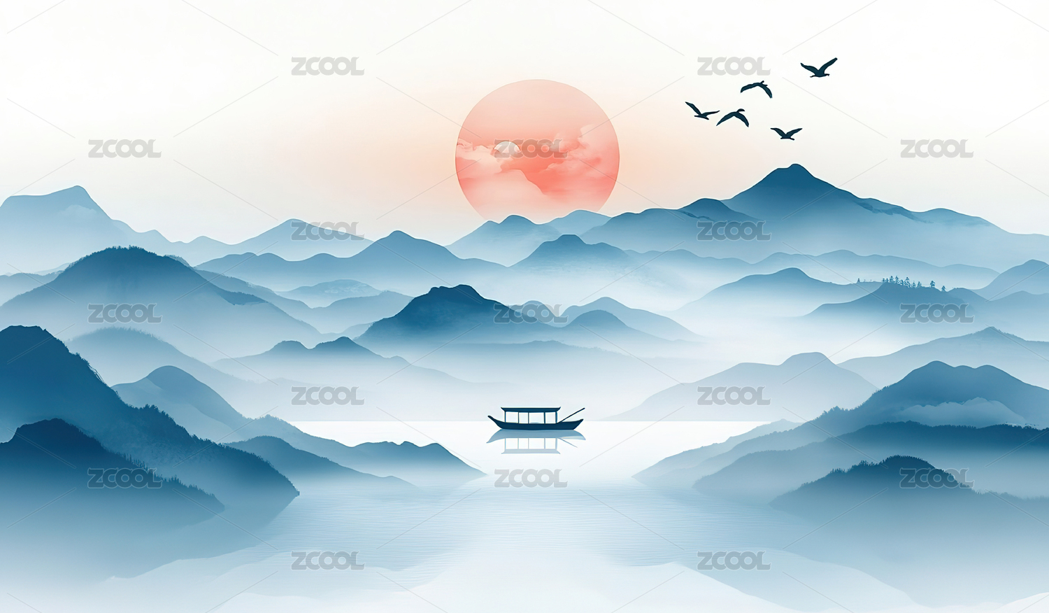 中国传统浅蓝色山水古风国风水墨画背景壁纸