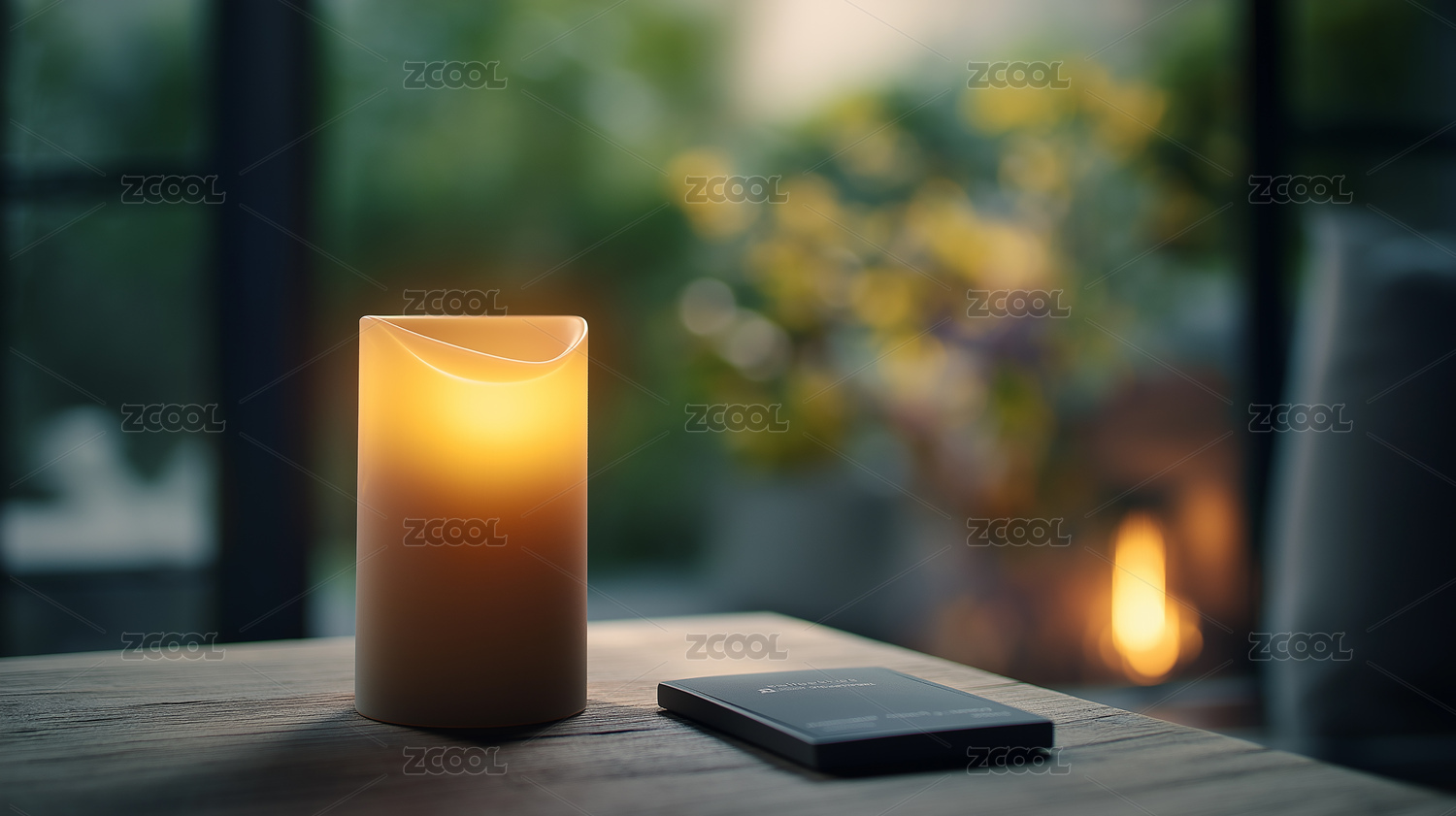 木桌点着蜡烛旁有手机窗外绿植模糊